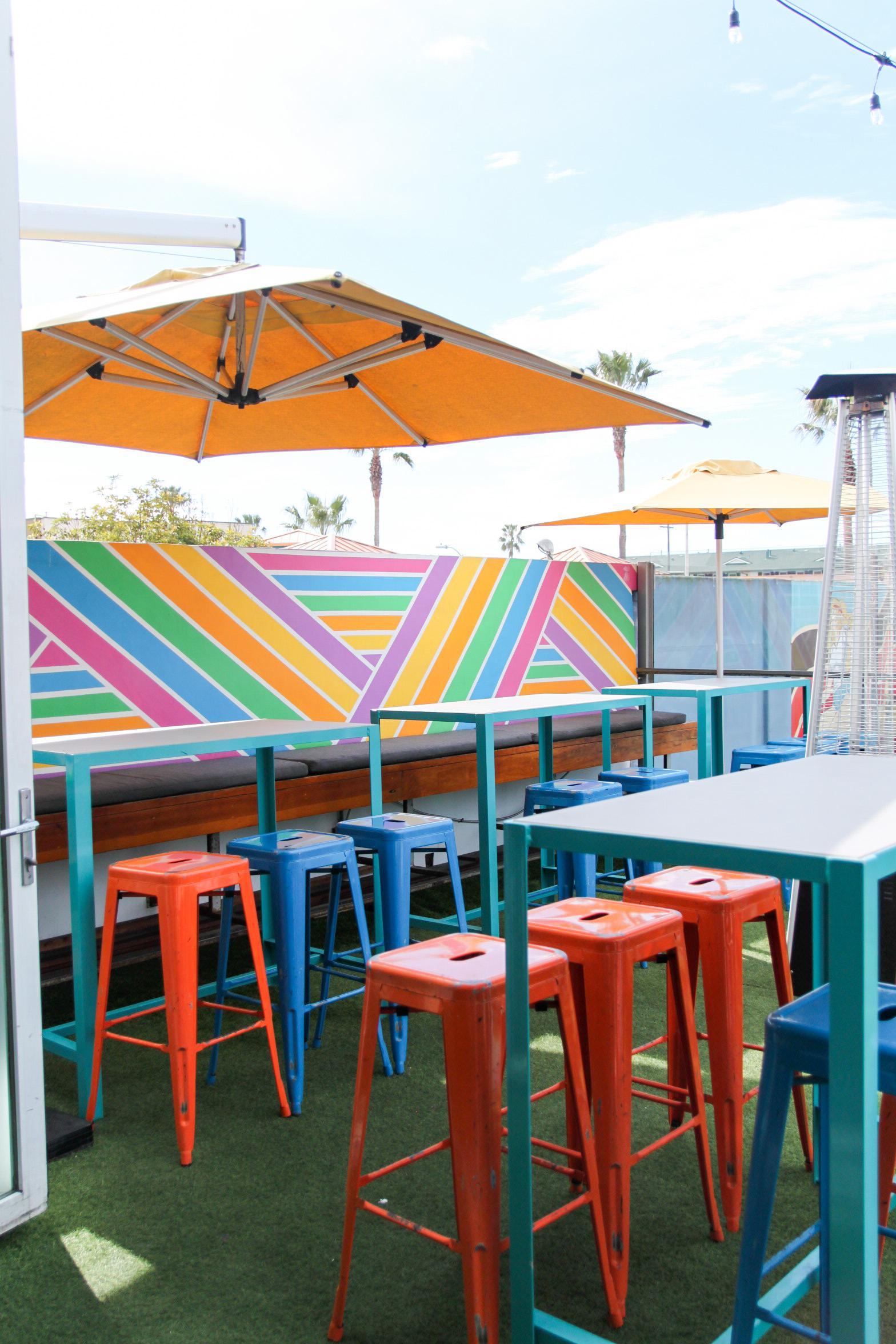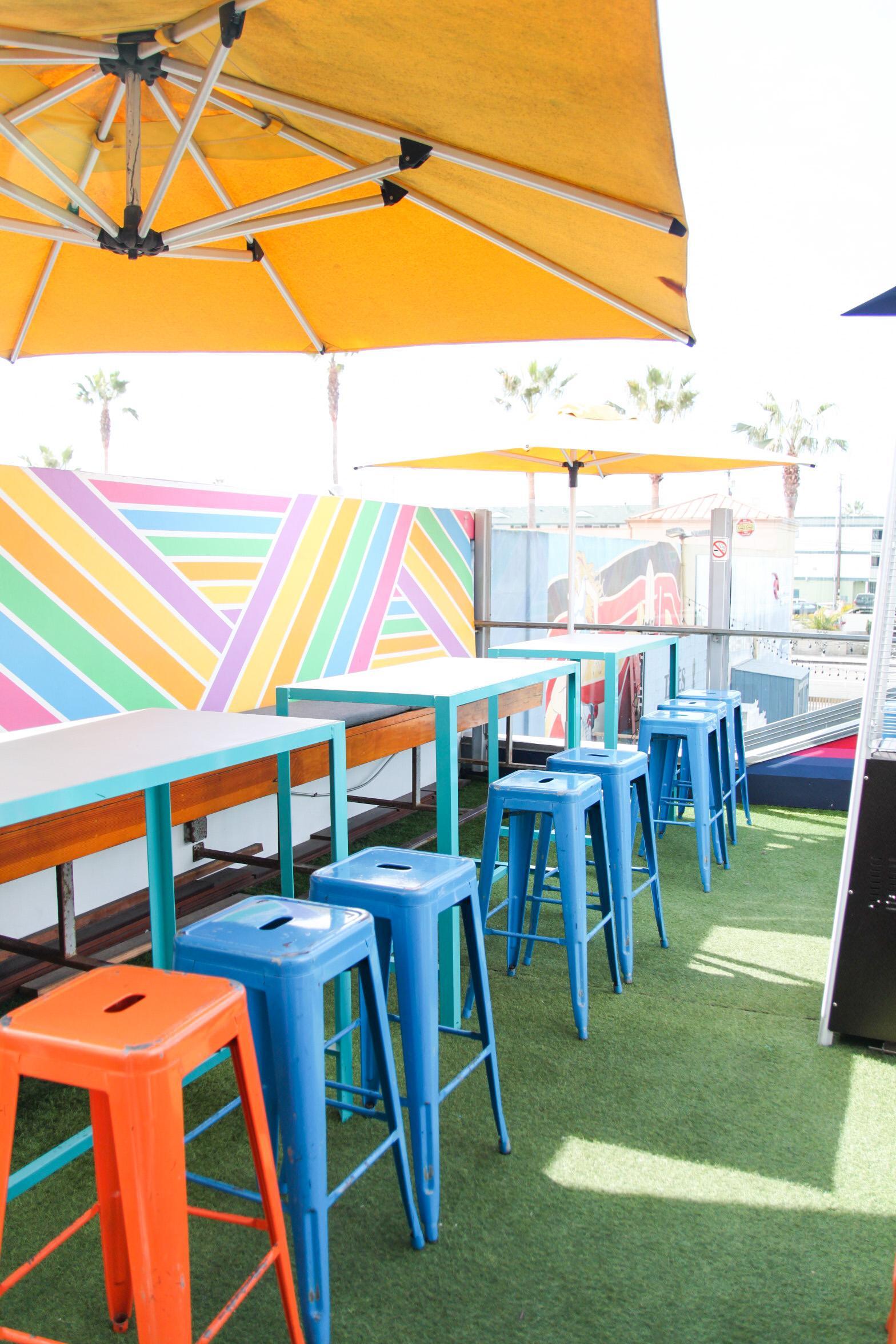 Views of the pacific ocean, bright and colorful decor, umbrellas, outdoor heaters