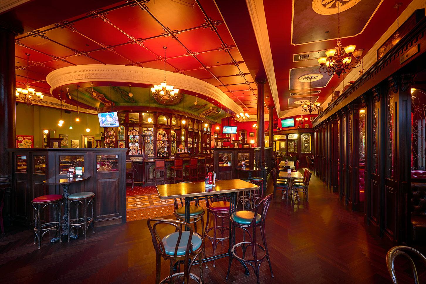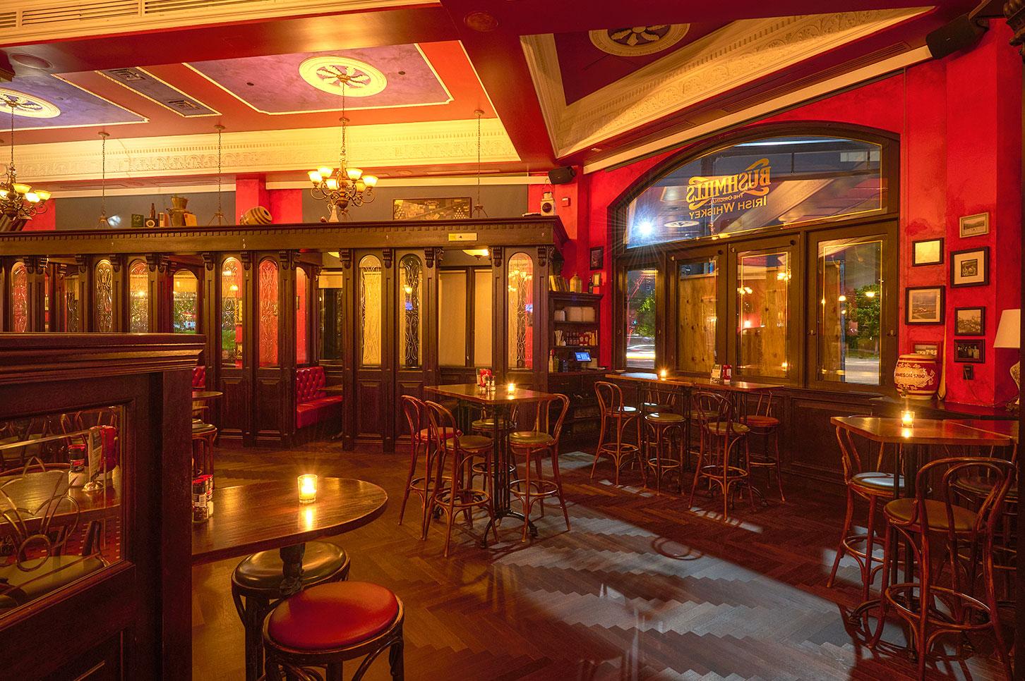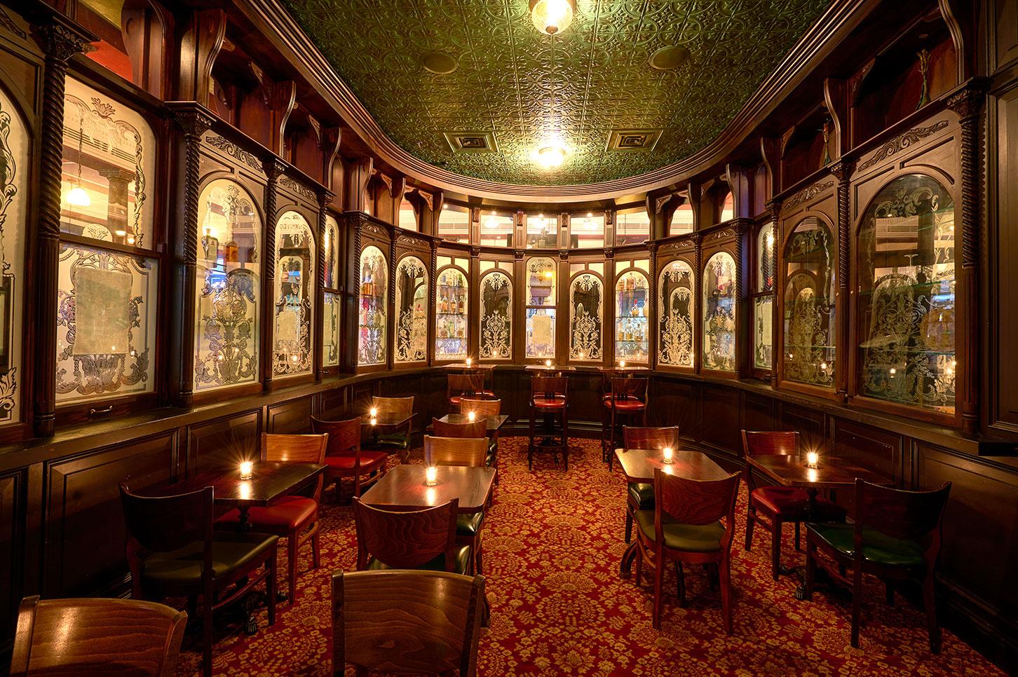Designed and built in Ireland, the majority of our entire pub was shipped across the ocean and assembled onsite. From the beautifully carved wood, cut glass and green marble bar to the hand-painted ceiling that is awash in a warm, aged glow — every detail is welcoming you in and encouraging you to celebrate.