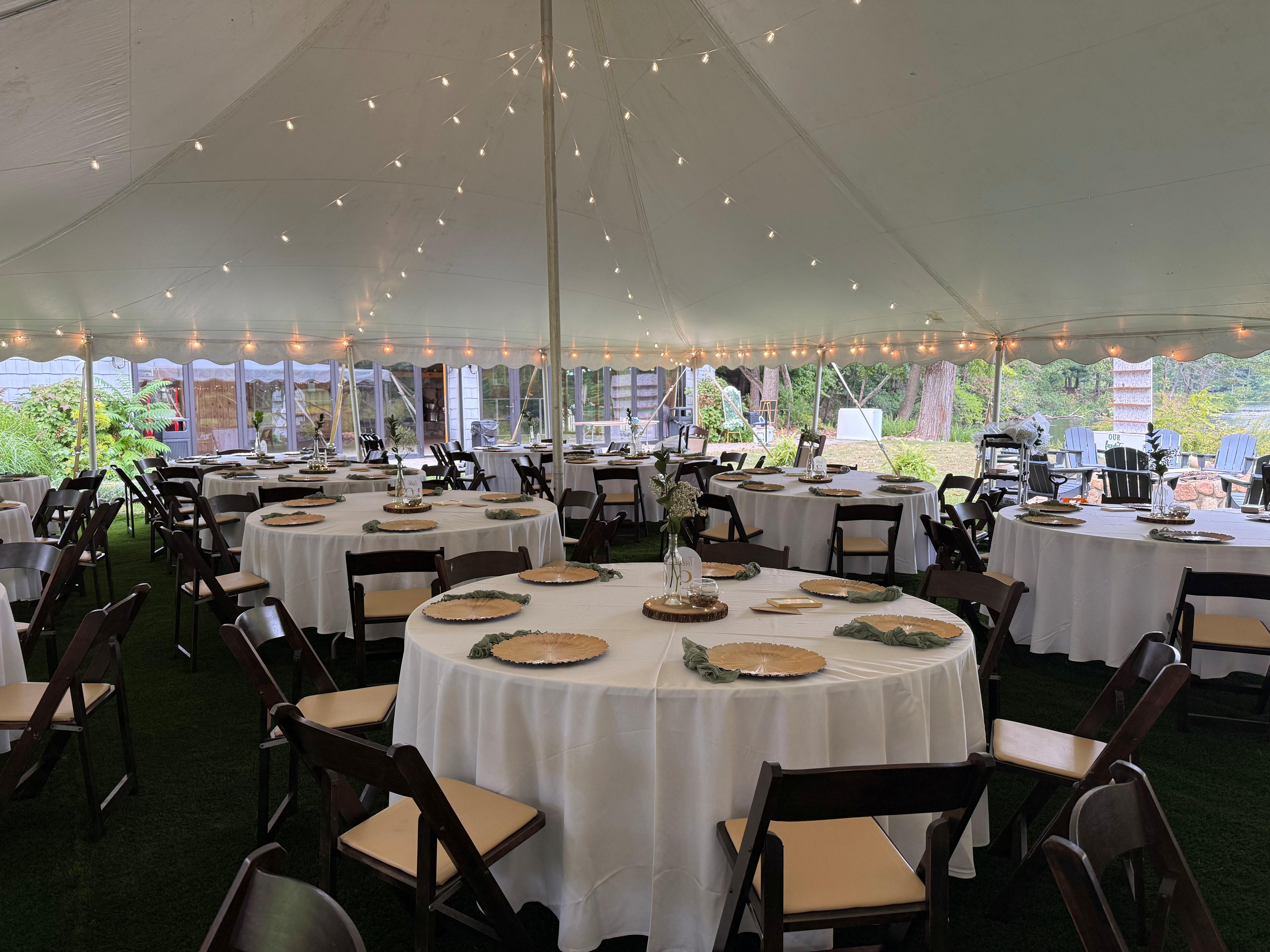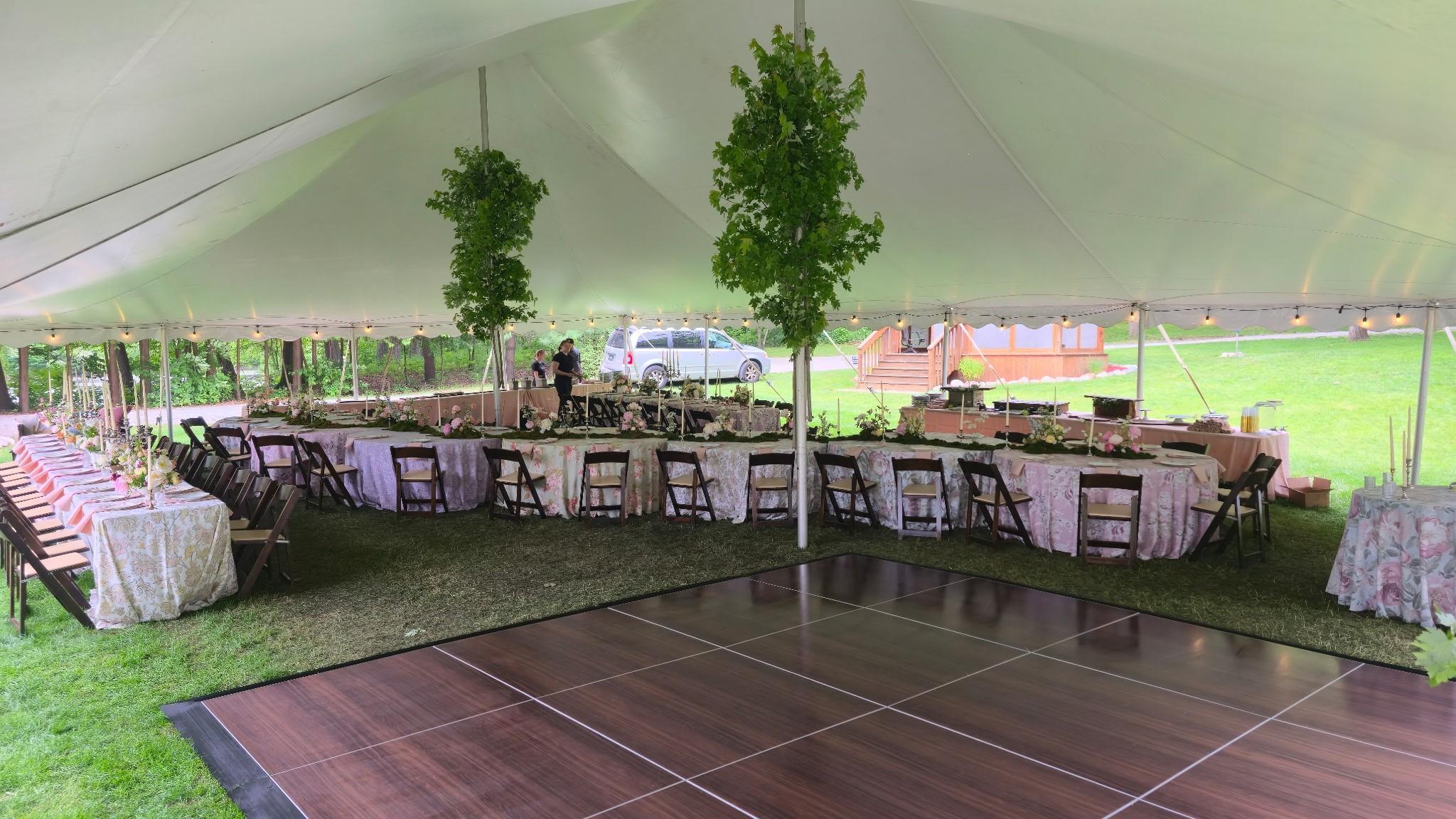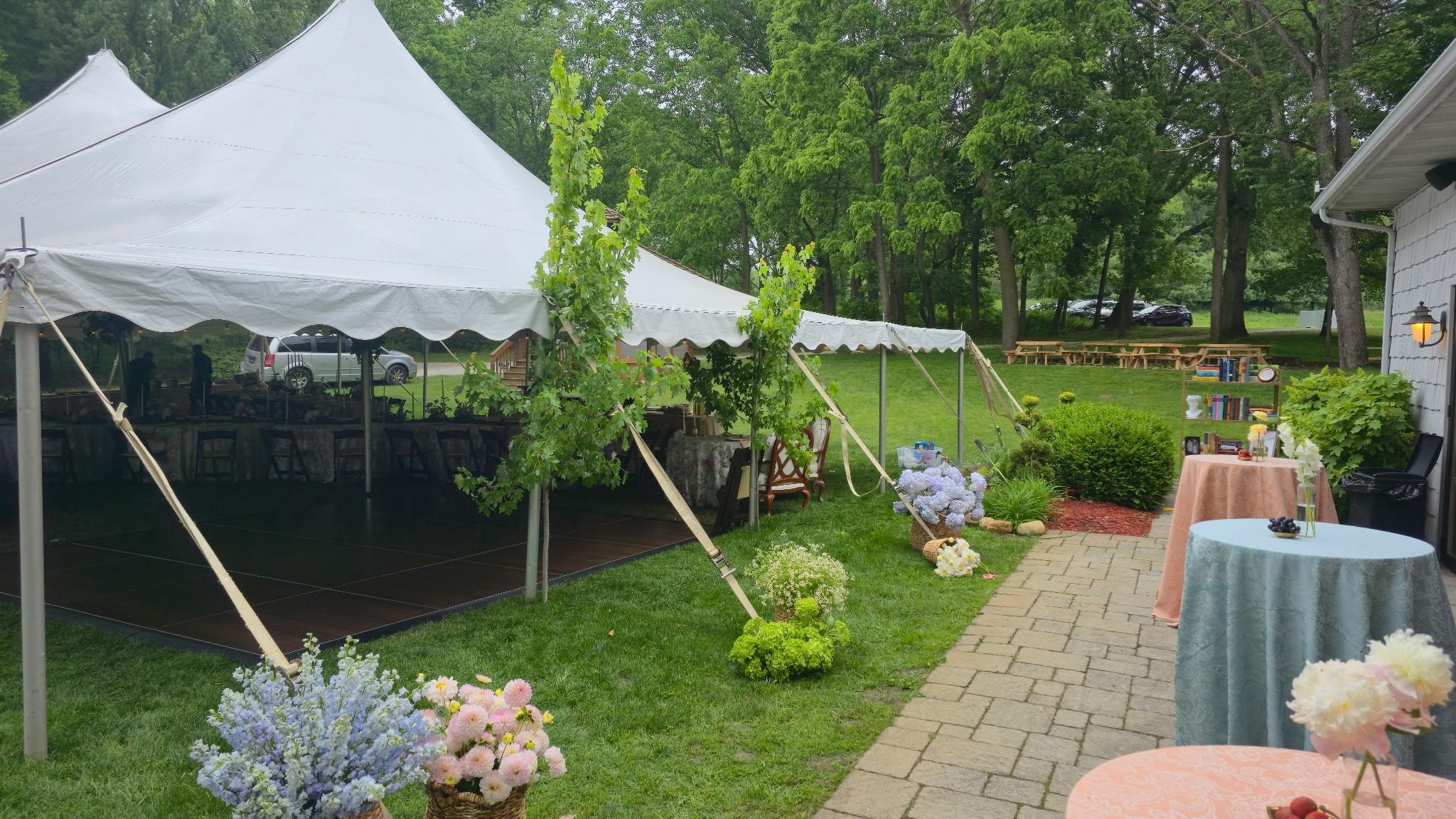 Attached to our party barn, this high peak canopy tent allows for comfortable events in excess of 200