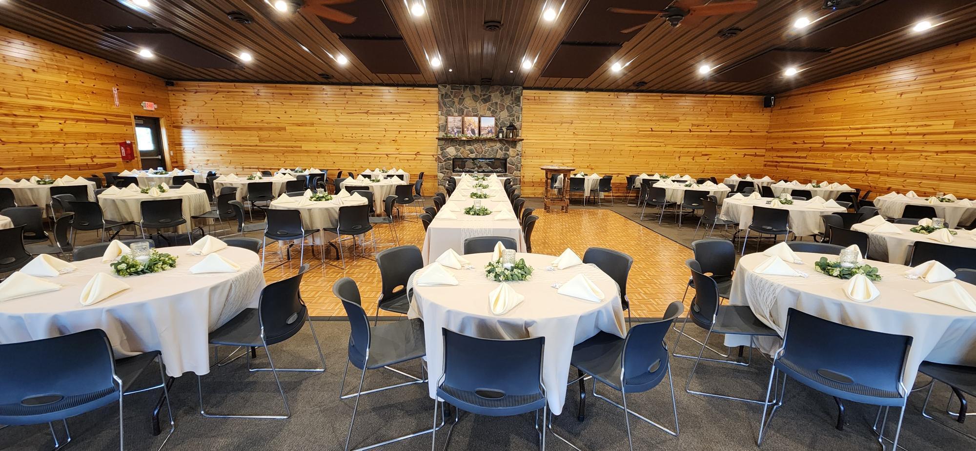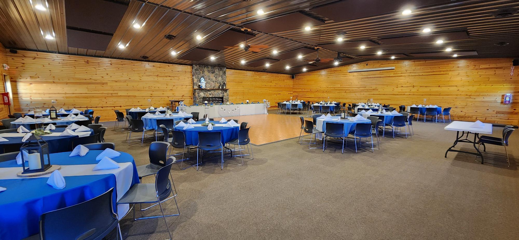 The Main Lodge seats approximately 200 people. This space has sixteen-foot vaulted ceilings with natural knotty pine walls and large windows facing the ski slopes. The Conference Center comfortably seats 200 people and is attached to the Main Lodge. This space has vaulted ceilings with natural knotty pine walls, a fireplace and large windows facing the ski slopes. The Conference Center may be rented in addition to the Main Lodge.
