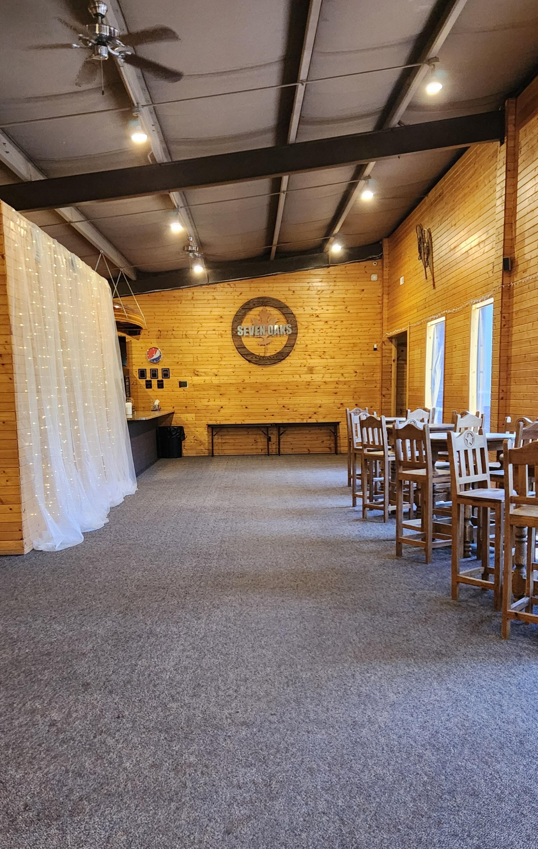 The Lodge at Seven Oaks in Boone, Iowa, offers a rustic and charming setting for weddings, nestled in the scenic countryside. The venue's cozy lodge and expansive grounds provide a beautiful backdrop for both ceremonies and receptions. Exceptional service and personalized attention ensure that every event is unique and memorable. The Lodge at Seven Oaks is perfect for couples seeking a relaxed and picturesque venue that embraces the beauty of the great outdoors. Seven Oaks Recreation offers an array of amenities to couples who rent the venue space. An on-site event team works with each couple to help design, organize, and implement a personalized event. Each function is supplemented by setup and cleanup services, which are provided by the staff. Couples can appropriate the venue's indoor and outdoor spaces, as well as the furniture that accompanies those facilities. Furthermore, the lodge boasts a large kitchen that serves as an ideal space for caterers to prepare the wedding meal.