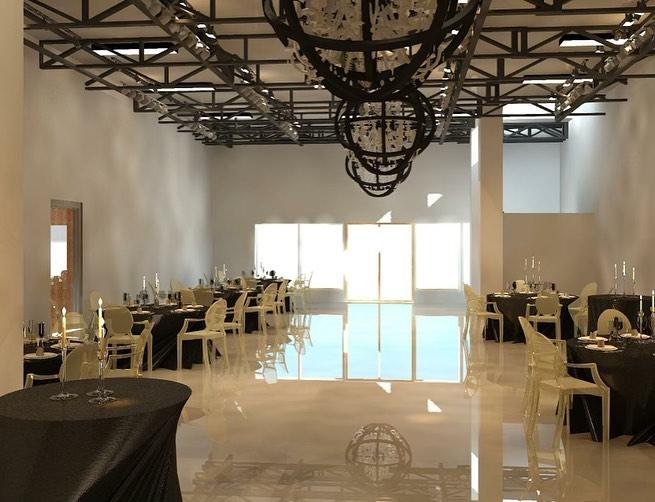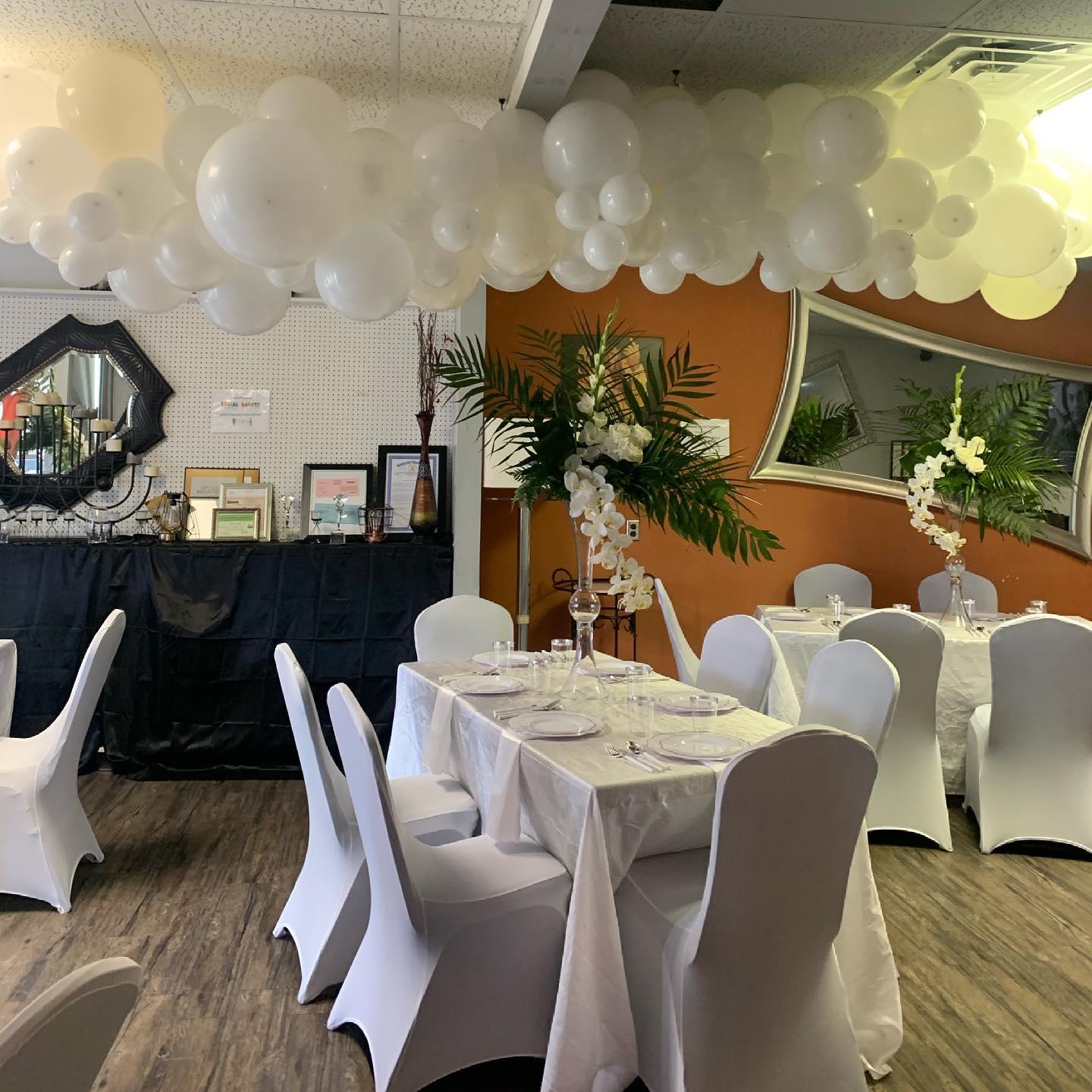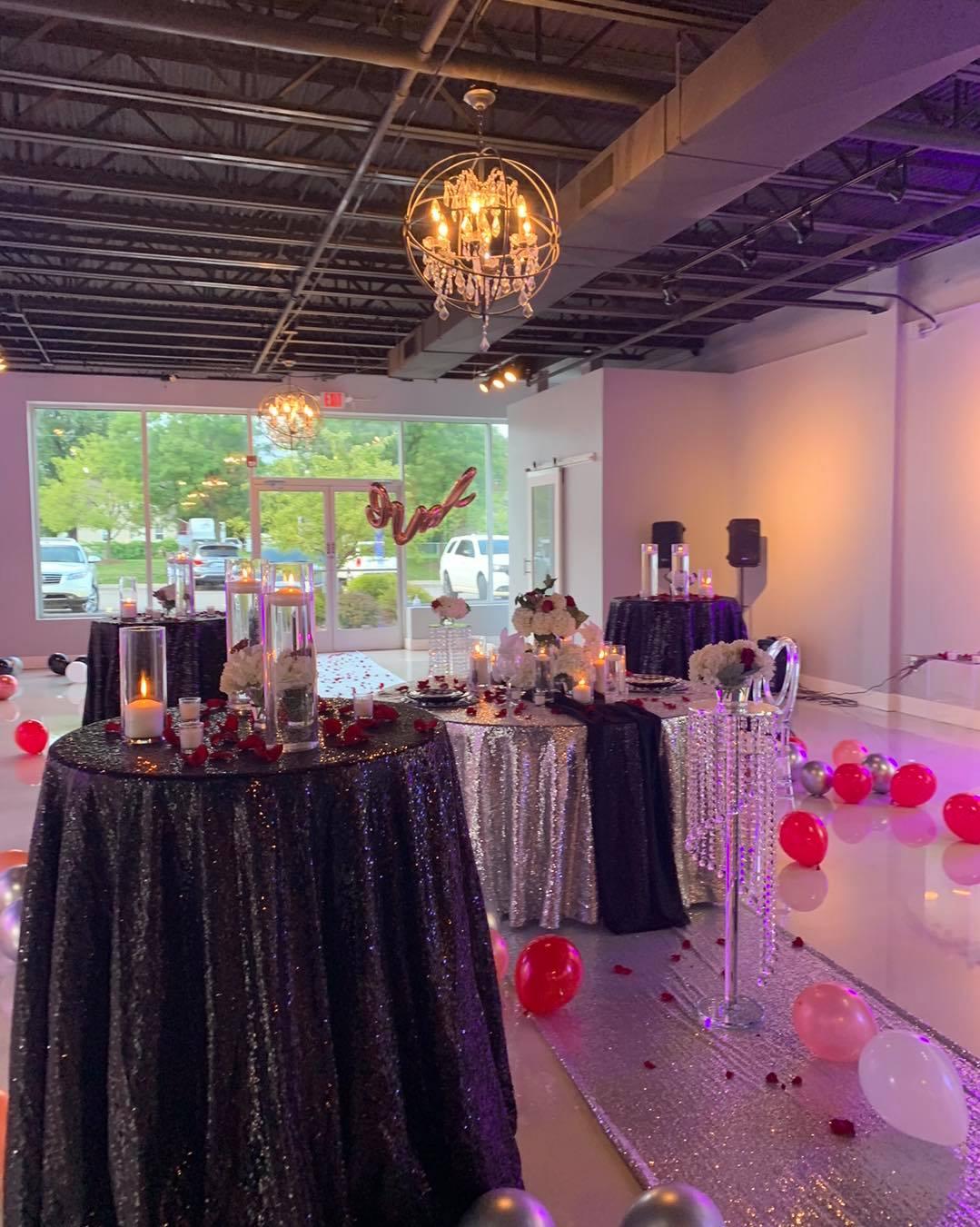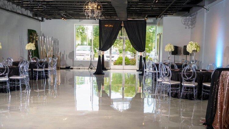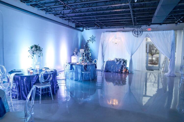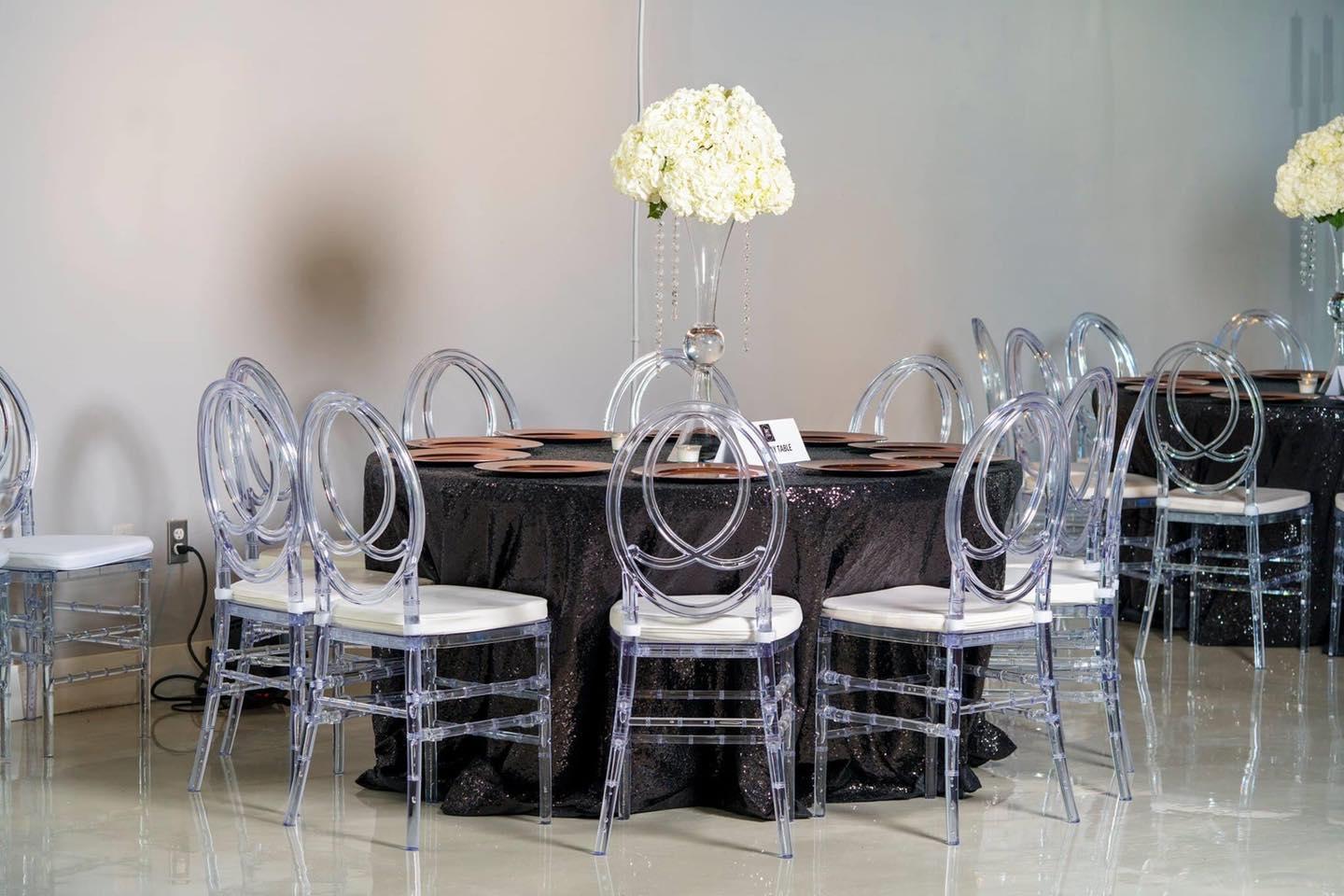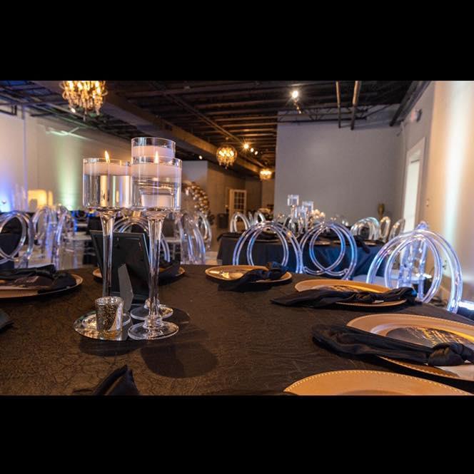 Six Hour Rental (includes set up and clean up), 60" Round Tables, 6ft Banquet Tables, Crystal Infinity Chairs, Uplighting, Black Table Linen, Silver, Gold or Rose Gold Charger plates, 4 x 8 Green Wall, Kitchenette.