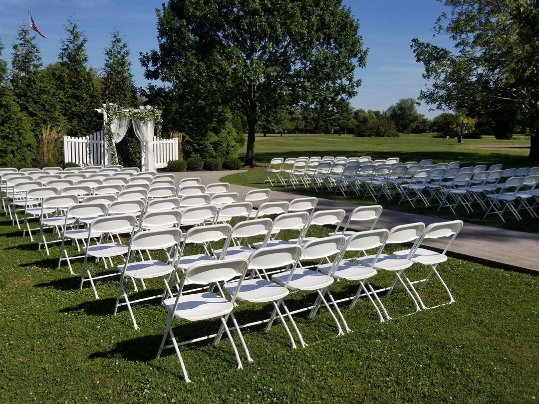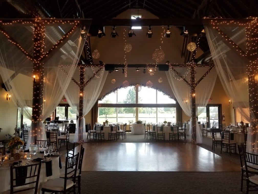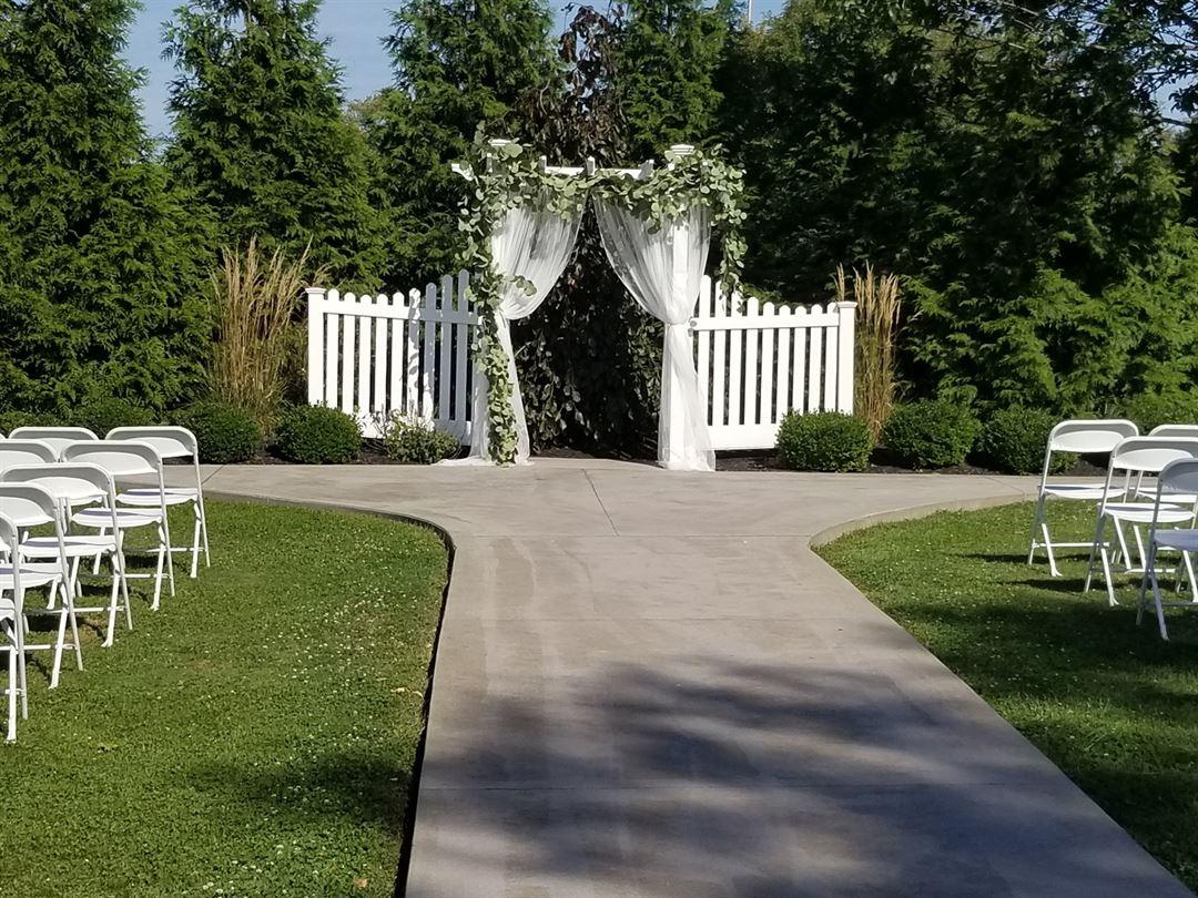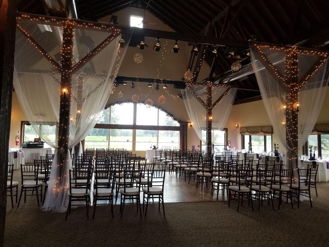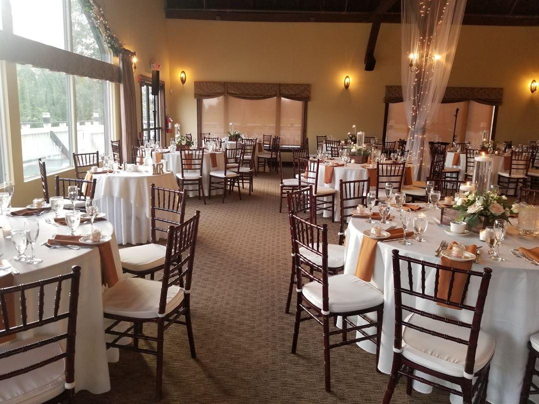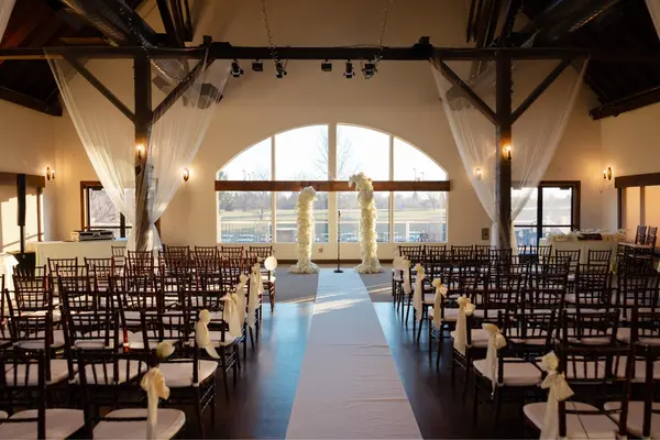 The Loft at Landis Creek is designed to harken back to the English Tudor era. With its 28 foot high ceiling, open gables, and floor-to-ceiling windows, it offers a bright and elegant setting for wedding celebrations. This charming setting can welcome up to 200 guests, still with plenty of room for a dance floor. With its adaptable layout, it can be altered to suit your celebration style and size. Outside, you and your guests can enjoy the scenic setting ideally suited to open-air ceremonies. The Eagle Room is located next to the Bar & Grille and can accommodate 50 guests. It also features an outdoor patio for relaxed dining. The outdoor ceremony site was specially designed to provide a private and romantic setting. A paved path leads to lush greenery surrounding an arbor with beautiful flowers. As an added experience, this venue offers private get-ready rooms, allowing you and your partner to prepare for your celebration in peace and tranquility.