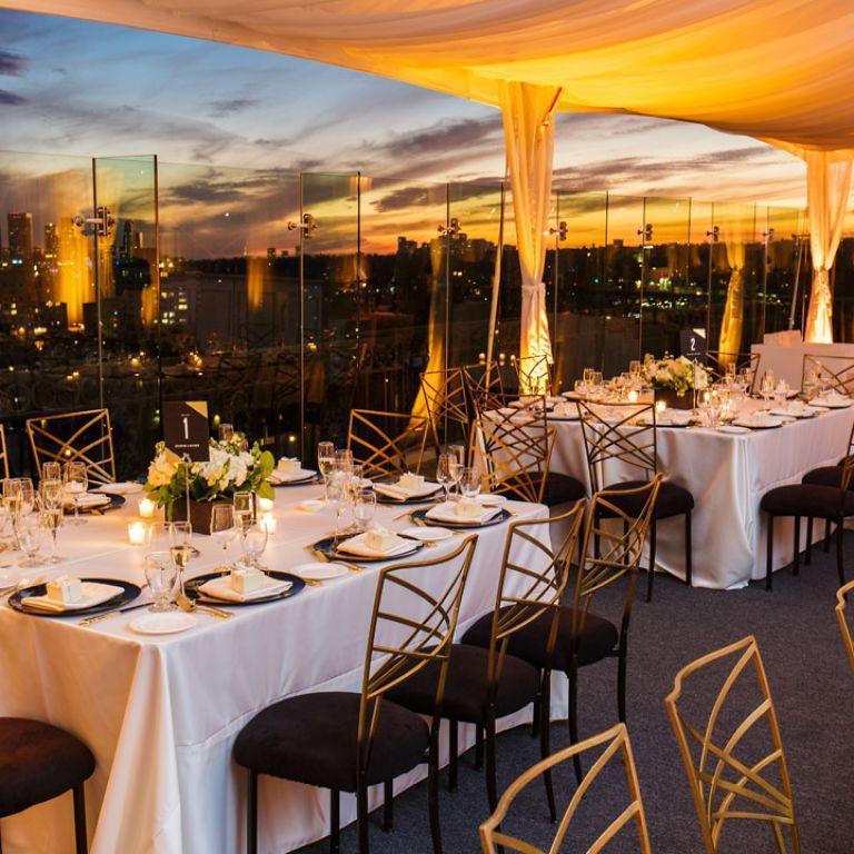Revel in 3,800 square feet of glamorous, private rooftop space with views of Beverly Hills and beyond. A custom-fit tent with retractable sidewalls complements the West End Rooftop November through March. Space is tented November through April months, please inquire for more information.