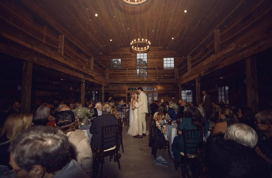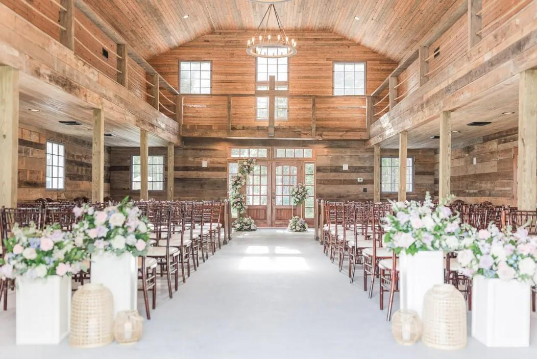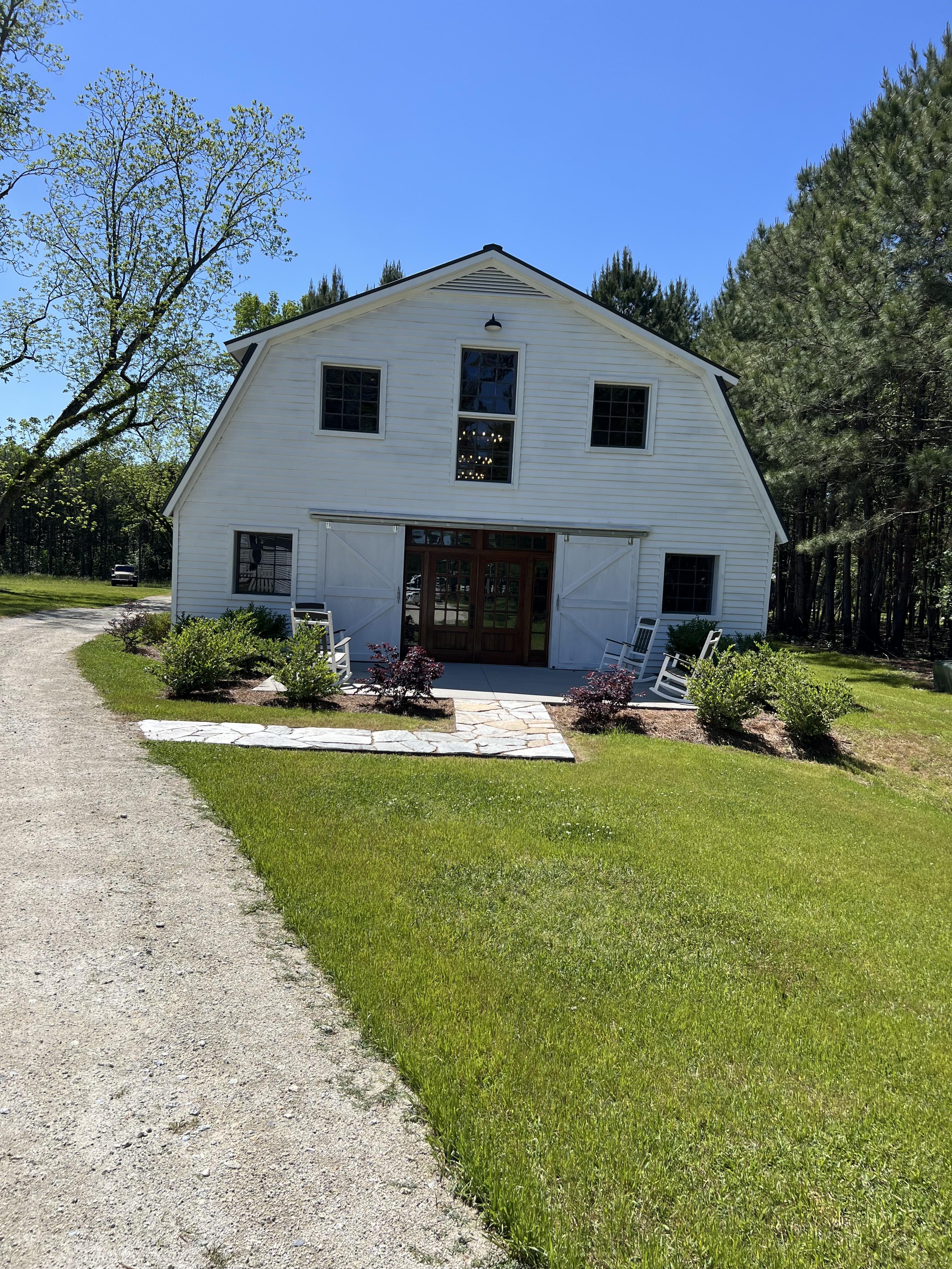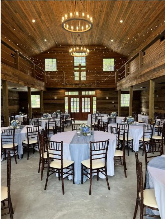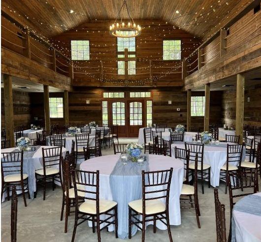 This space offers approximately 2000 square feet of space to host a rehearsal dinner, wedding ceremony or wedding reception or all three. The barn has central hvac, 3 exquisite chandaliers, tongue and groove pine ceilings and original rough-cut timber walls. There is a 29x26 patio with Edison lights with tables and chairs and a fire pit as well as a 22x14 front patio.