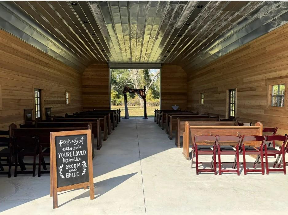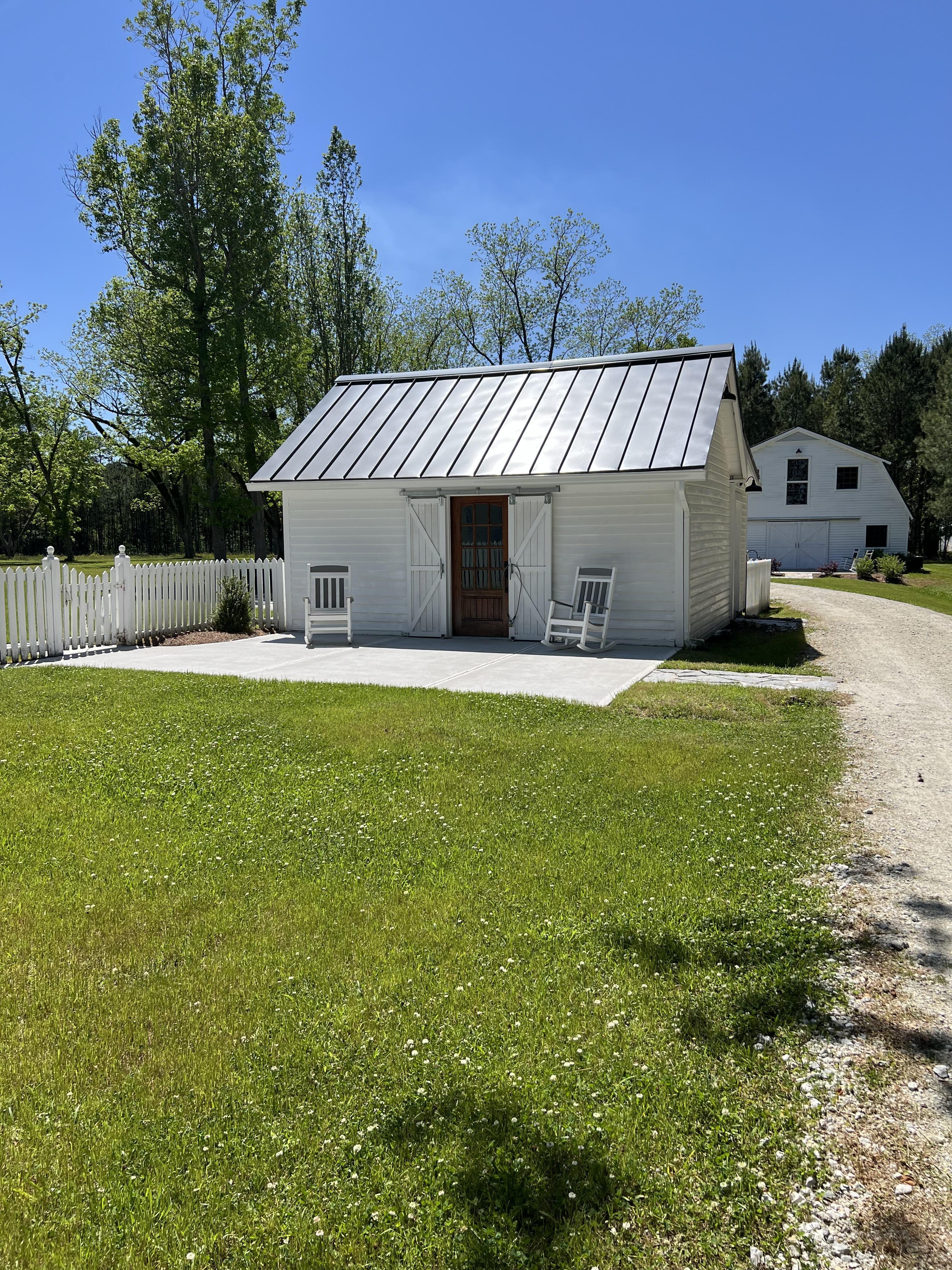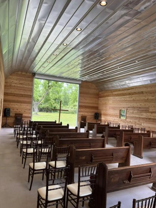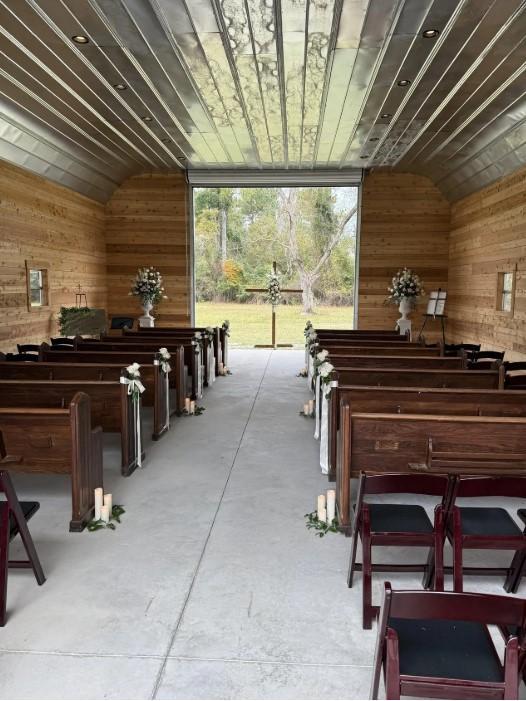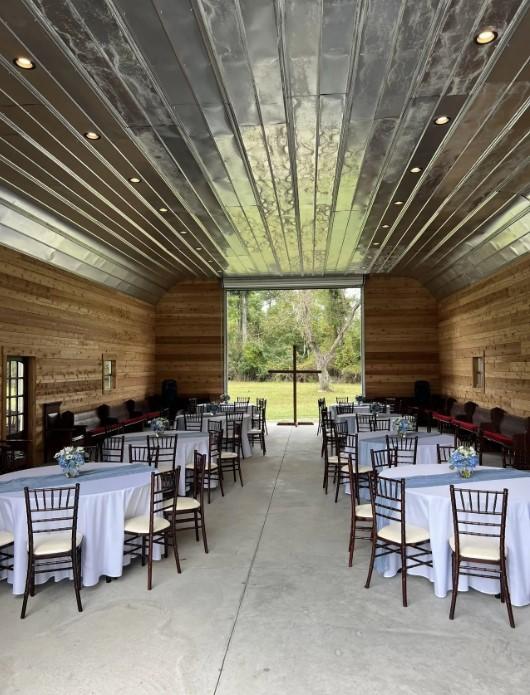 This newly finished barn features cedar siding, a tin ceiling, full electric, 14 church pews, tables and chairs. There are 2 20x50 concrete lean-to's on each side of the barn. The vast 30 foot raise up doors has a feel of being outside while protecting you for the elements. This space can be used for a rehearsal dinner, wedding ceremony or reception space. This barn is nestled in the back pecan trees between large pine stands.