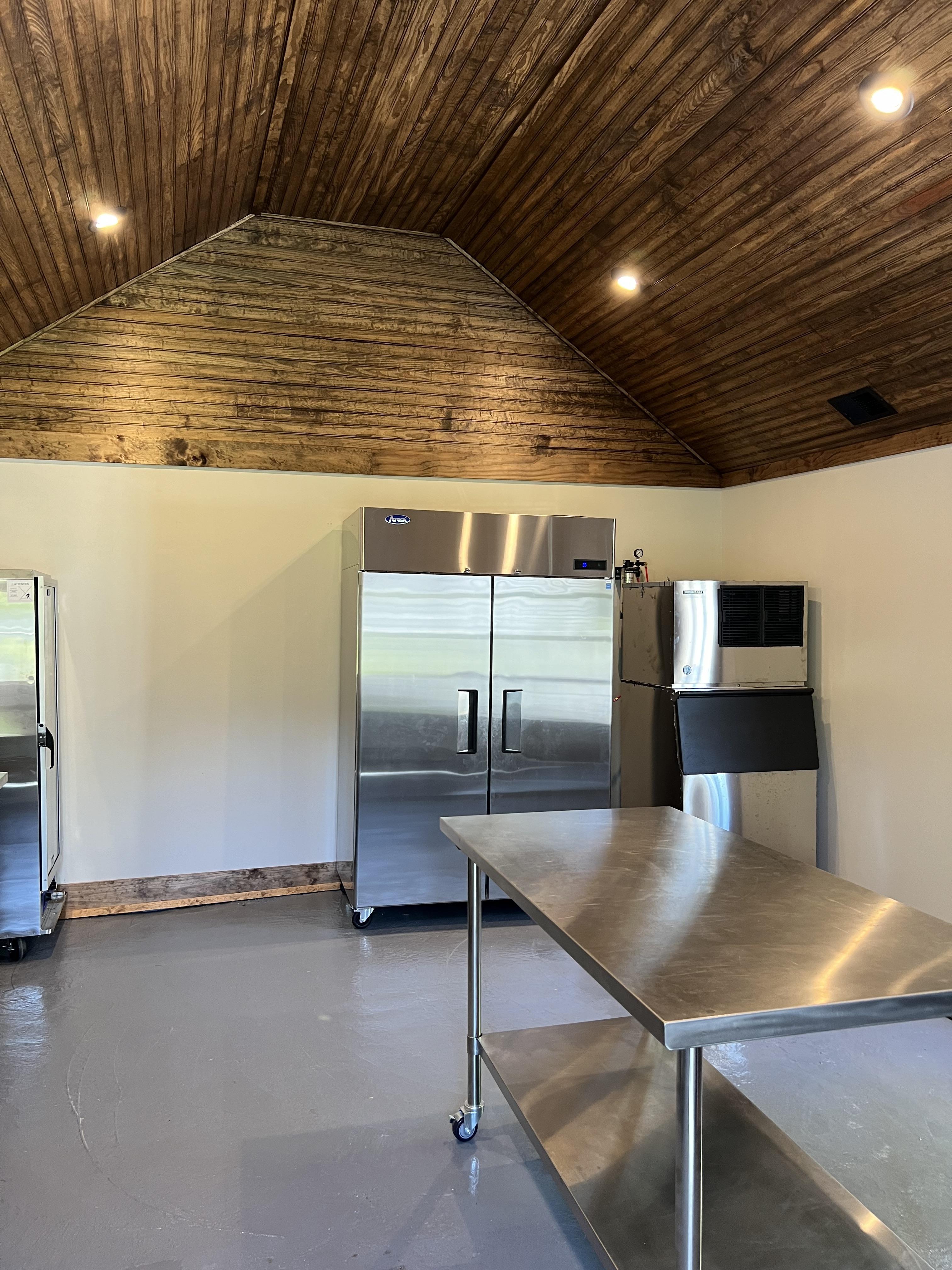 500 lb ice machine, double door refrigerator, warming oven, large farm sink, stainless steel counter space.
