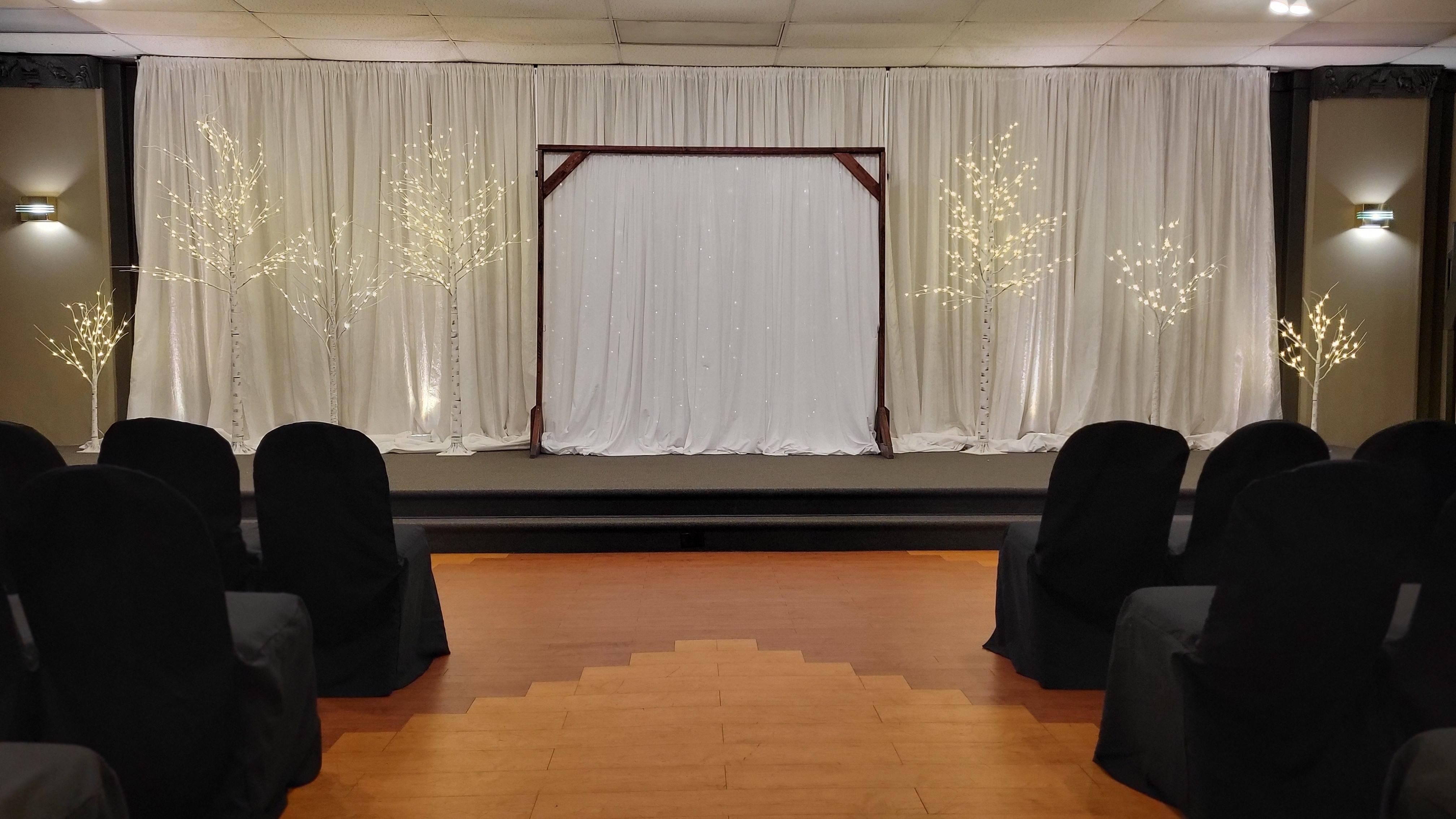 Elegant French Art Deco ambiance Permanent stage 32x32 foot dance floor Special event lighting Bridal suite