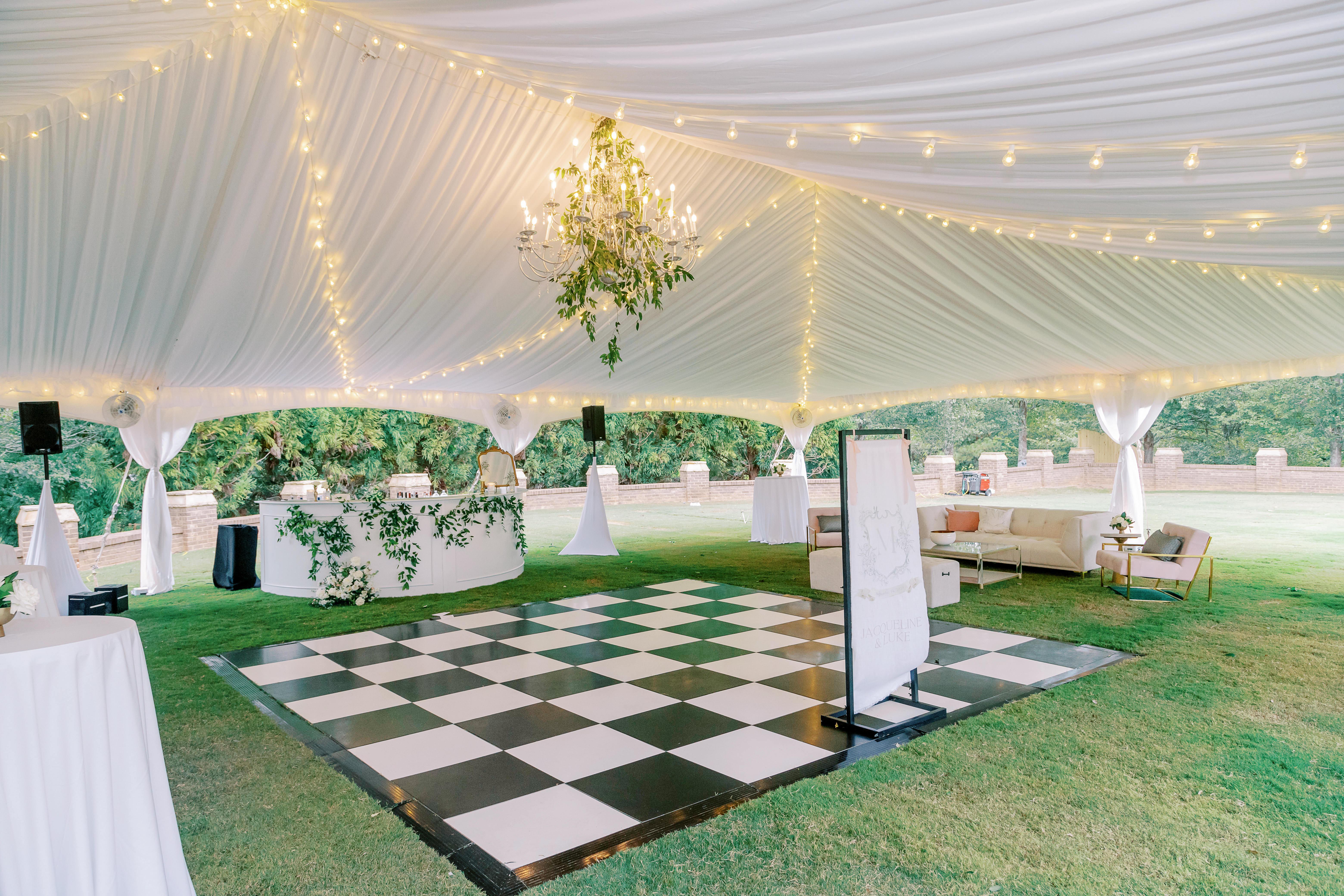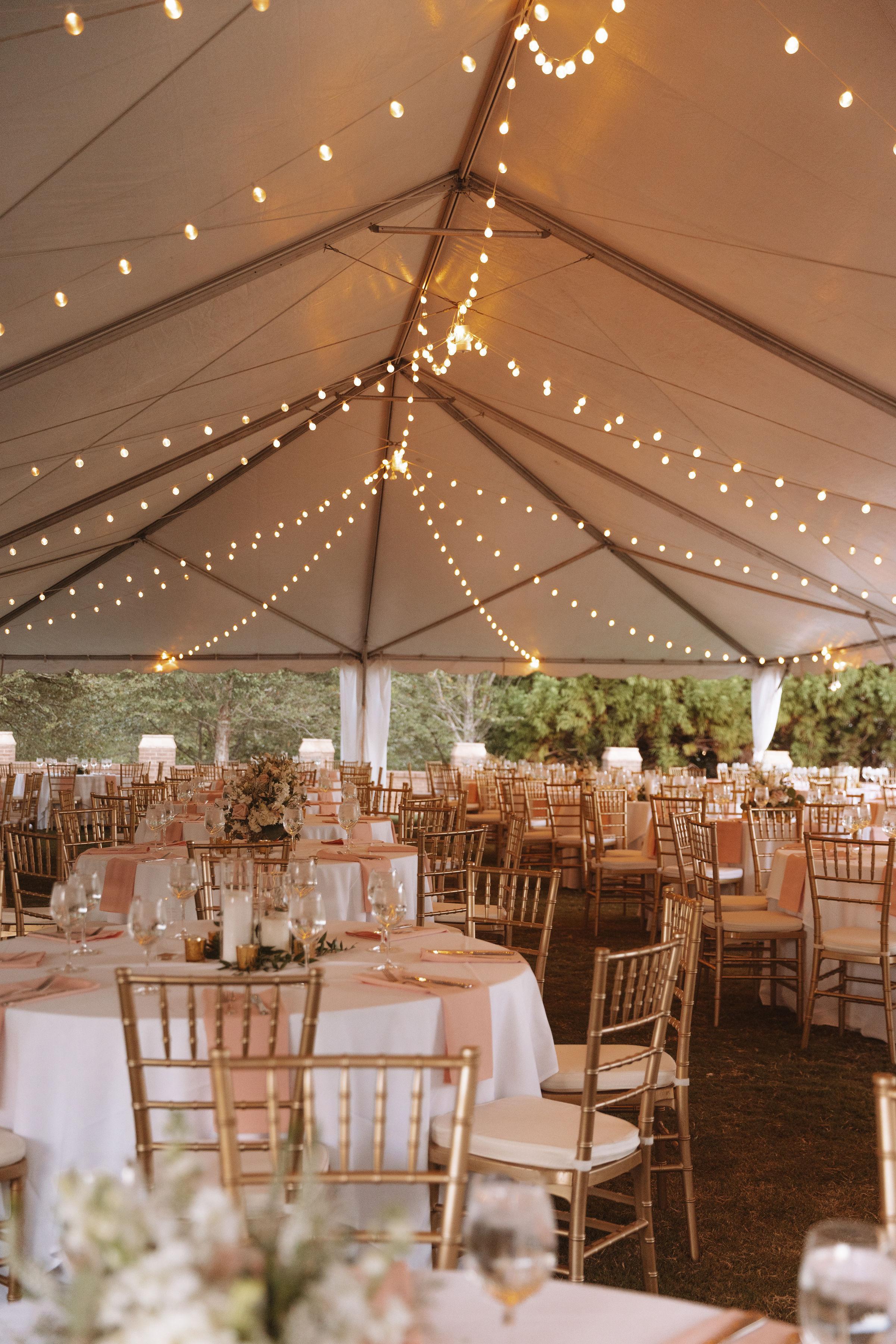 The grand event lawn is perfect for outdoor ceremonies, cocktail hours or large wedding receptions. With a beautiful tent rental surrounded by white drapery, the event lawn is perfect for large wedding receptions.