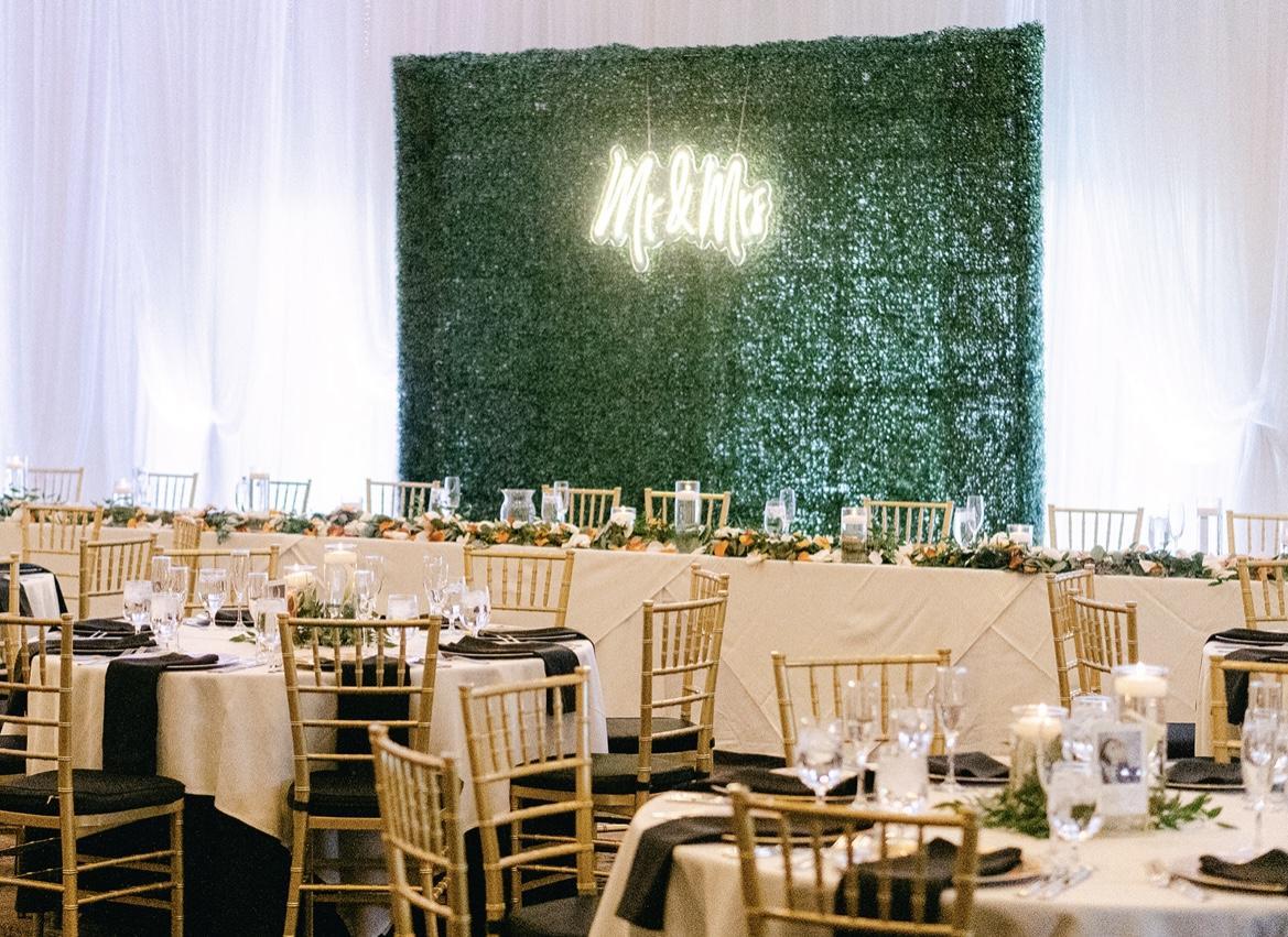 - Gold Chiavari Chairs - Round & Rectangle Tables, Cocktail Tables, Banquet Tables - White or Black Linens, Overlays and Napkins - Glassware, Flatware, Plates, Serving Utensils - Black-Brown Dance Floor - A/V Equipment