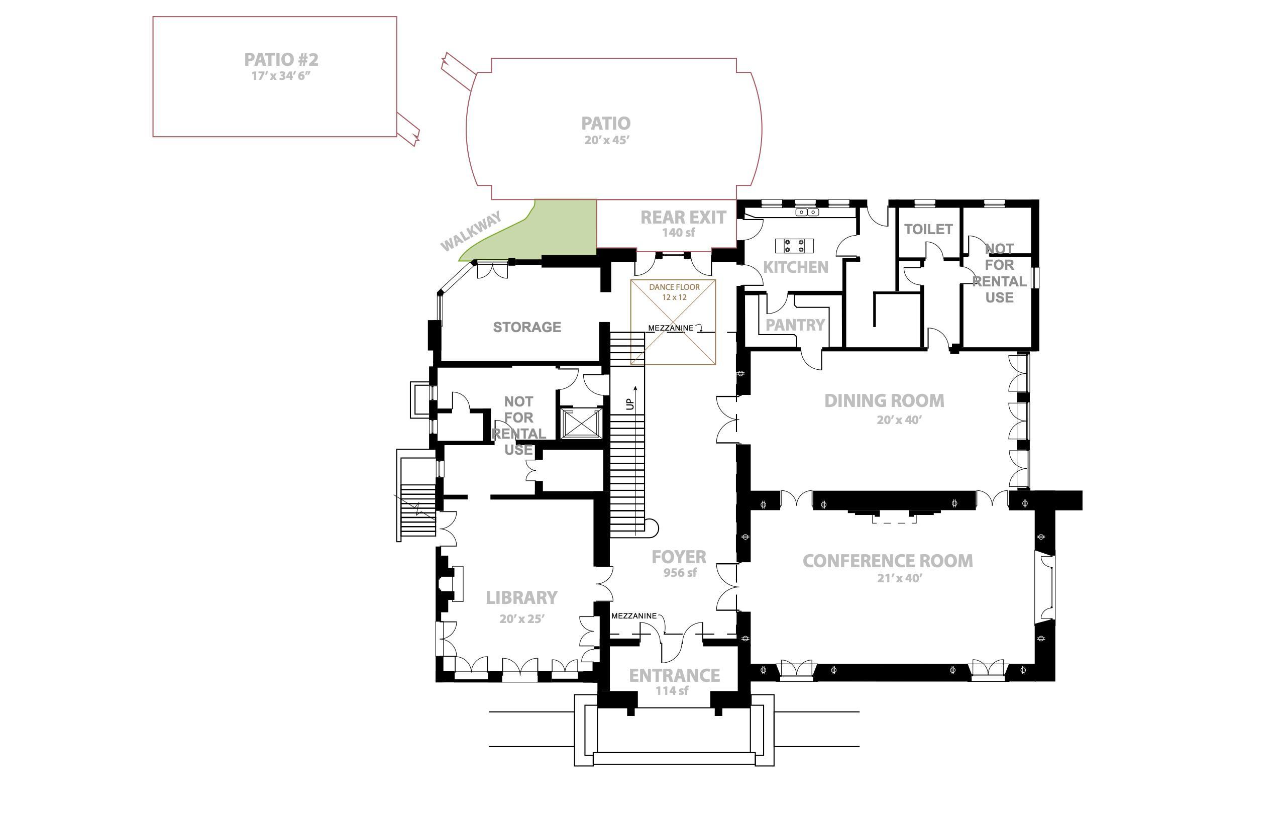 Saturday rental only. Private use of the space from 11am-11pm (12hrs) on the day of the event. (includes the living room, dining room, library, foyer, mezzanine, kitchen, garden patios, & upstairs wedding suite) Prep/rehearsal time in the space from 1pm-5pm (4hrs) the Friday before the event. Setup & breakdown of furniture owned by The Maxwell House, Access to nearby parking lot + free public street parking available Dance floor
