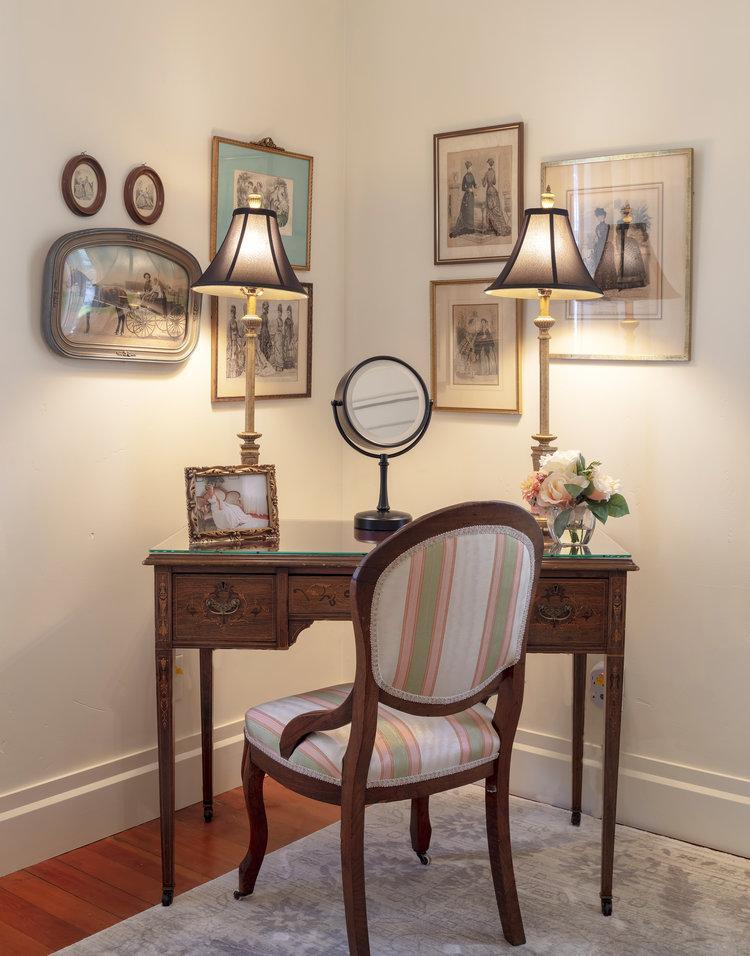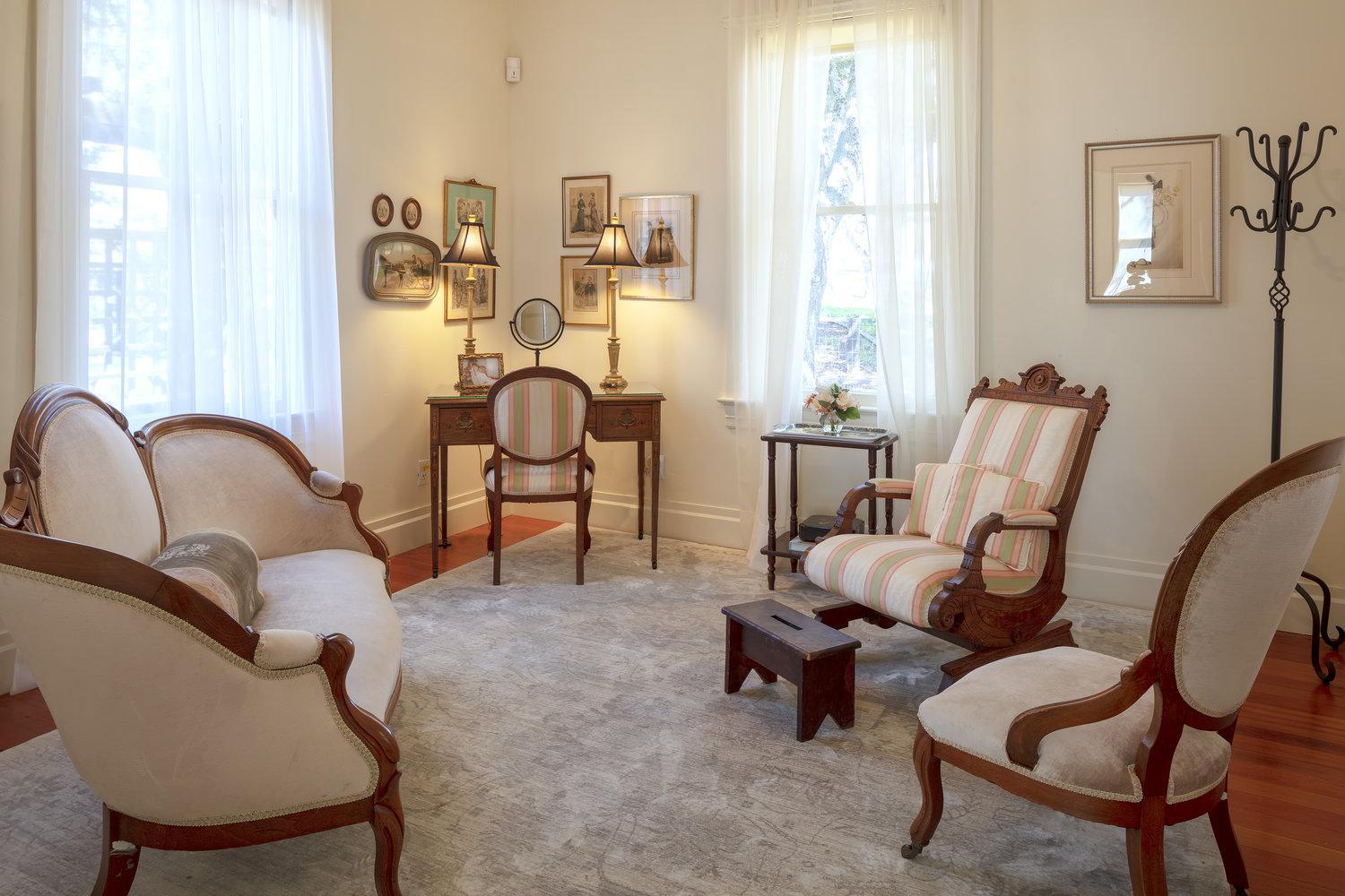 The bridal suite is a perfect place for the wedding party to relax and primp prior to the Ceremony. The suite has period details and an oversized mirror.