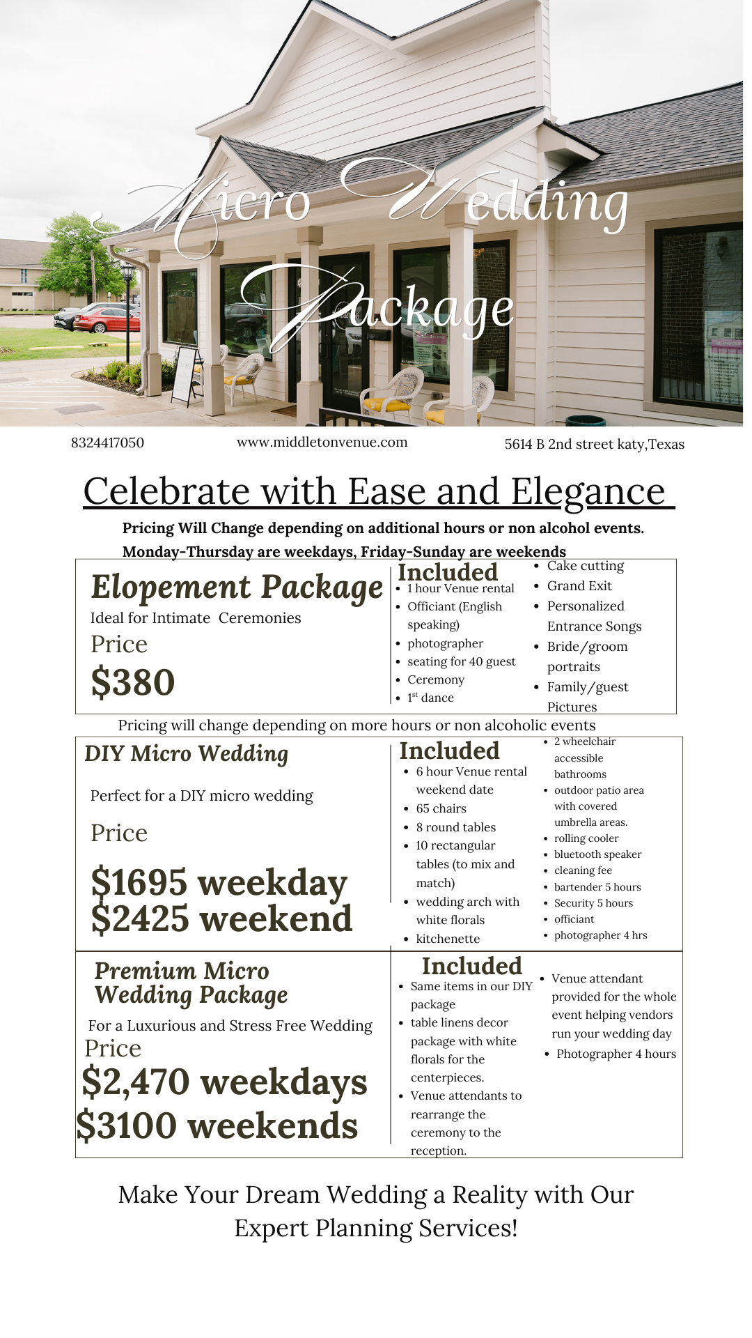 A look inside our elopement package! $380 What's included: 1 hour venue rental Officiant Photographer Signing of marriage license Ceremony 1st Dance Cake cutting pictures (cake not provided) Bride/groom portraits Family/guest pictures Grand Exit Pictures Seating up to 40 guest Elopement packages available Monday-Friday and Sunday Schedule your tour on website ⬇️ 📲www.middletonvenue.com 📍5614 B 2nd street Katy texas
