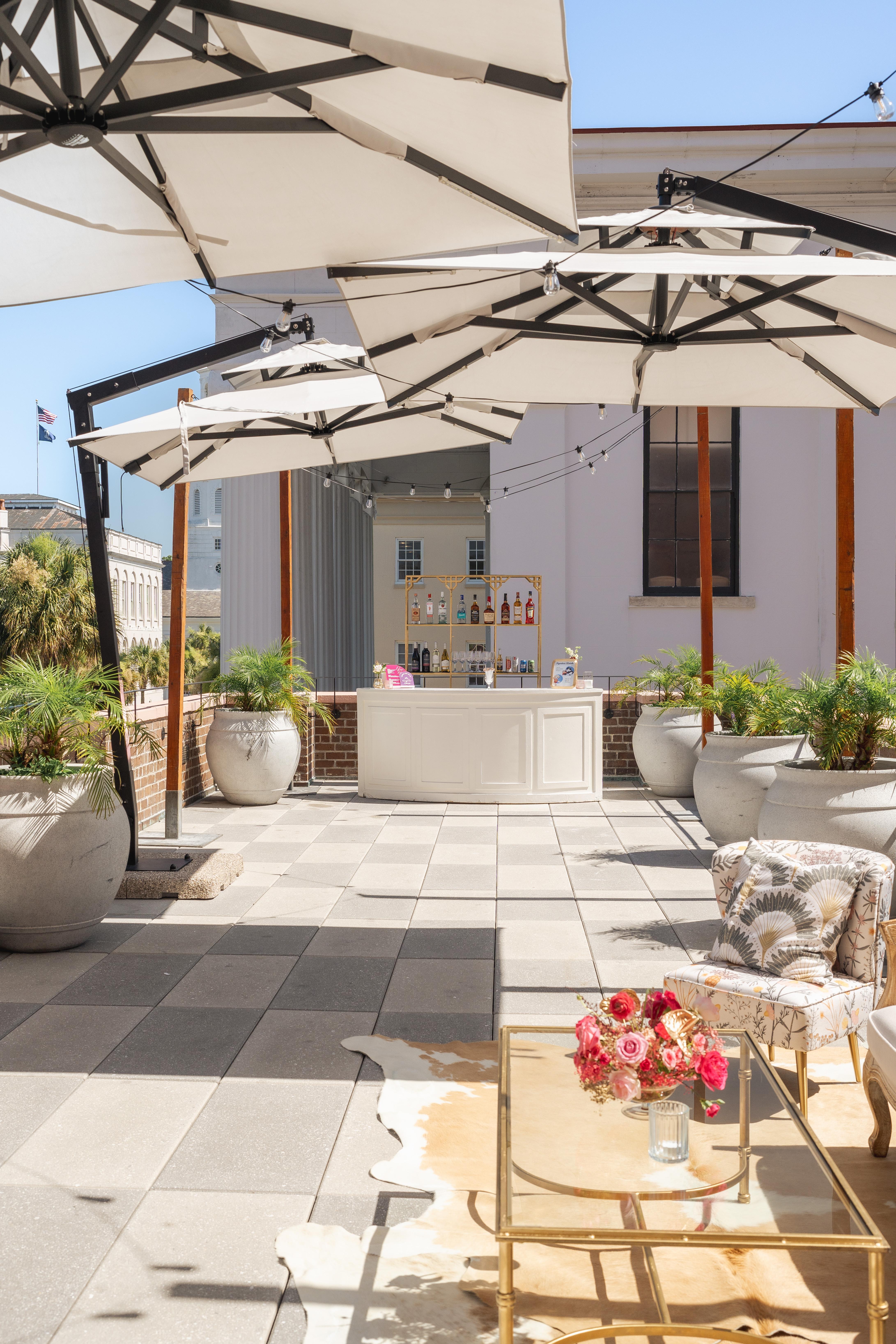 This open-air terrace overlooking Meeting Street is adjacent to Planters Suite on the second floor. Walk out large French doors onto the terrace with quintessential Charleston sights and charming neighborhood surroundings. An ideal space for a cocktail reception, ceremony, seated meal, or rehearsal dinner.