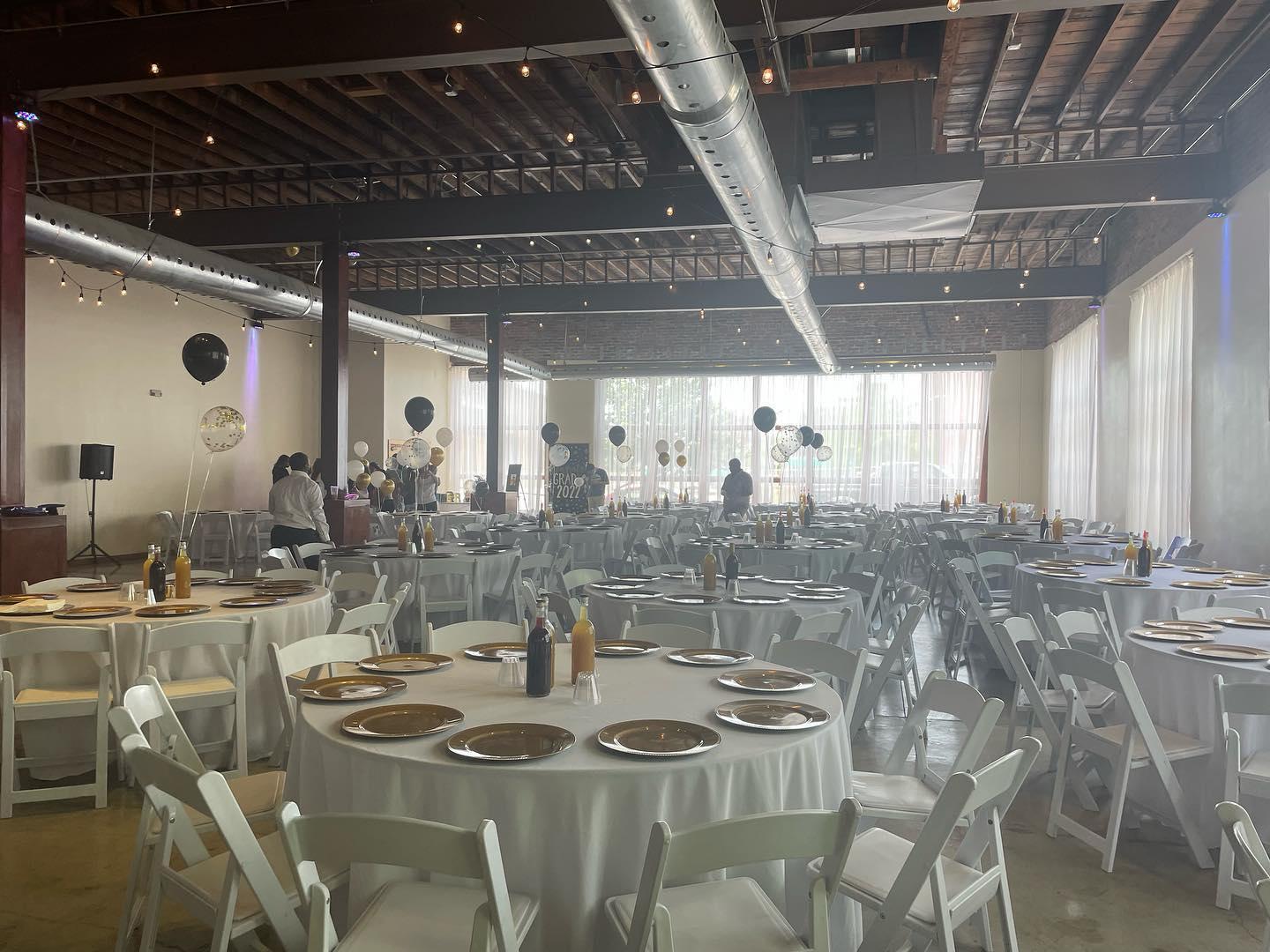 - 25 66" round guest tables, - 6' tables for bridal party, - buffet table, gift and etc, - 4 8ft wood kings tables - chairs - high top tables -floor length linens -set up and clean up -down lighting -two suites -access from 10am to midnight -decor options -parking -BYOB Options as well as bar packages -Indoor Ceremony options