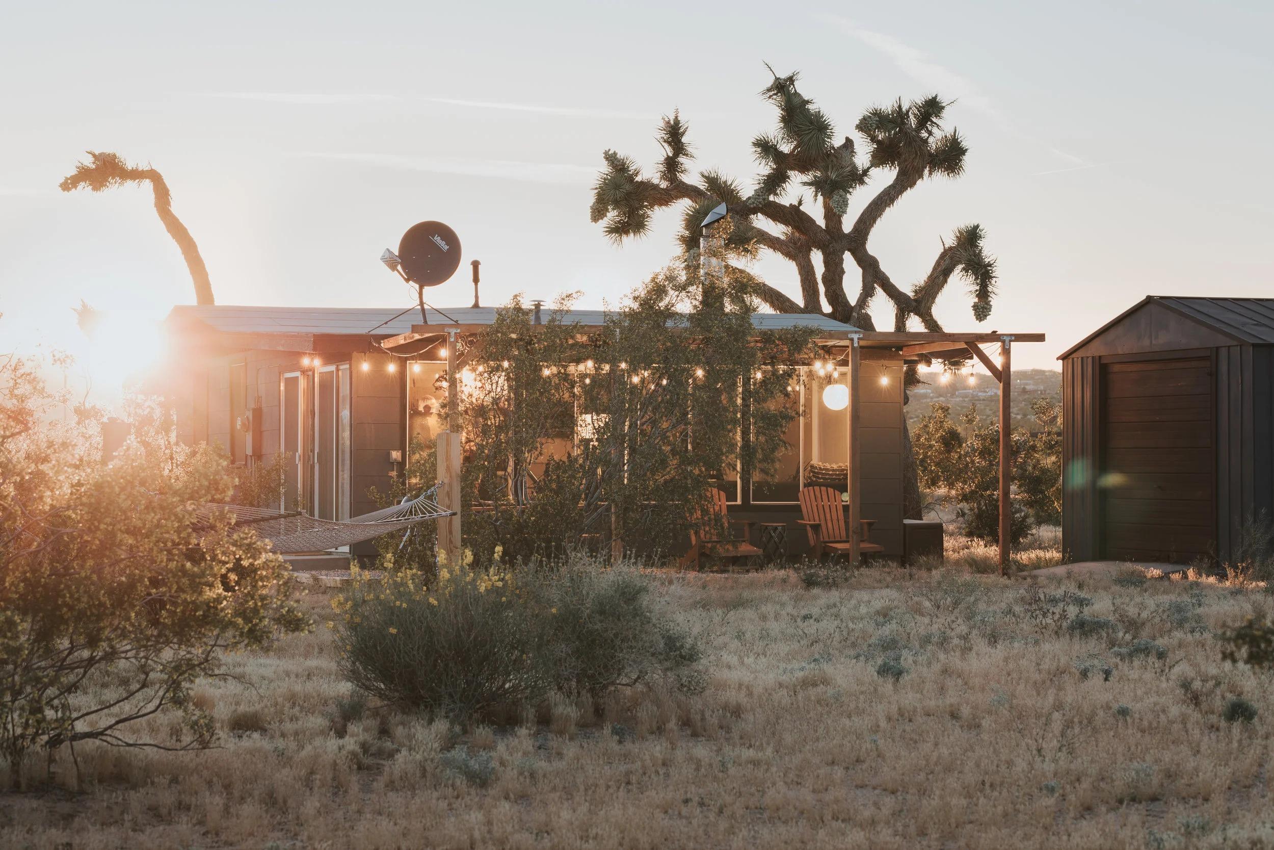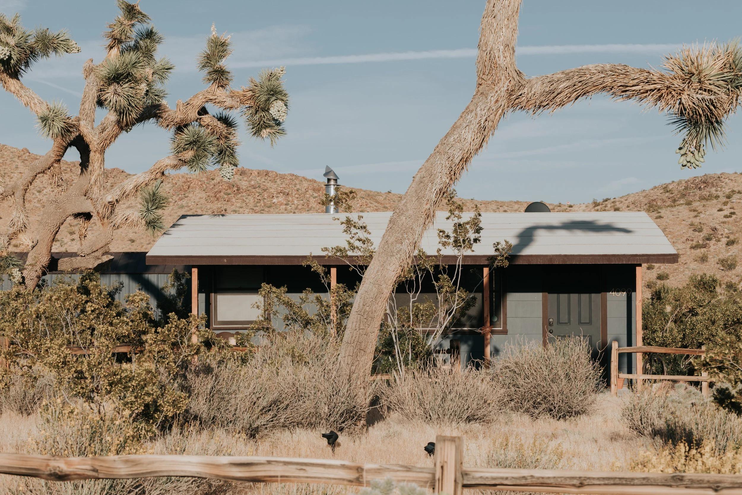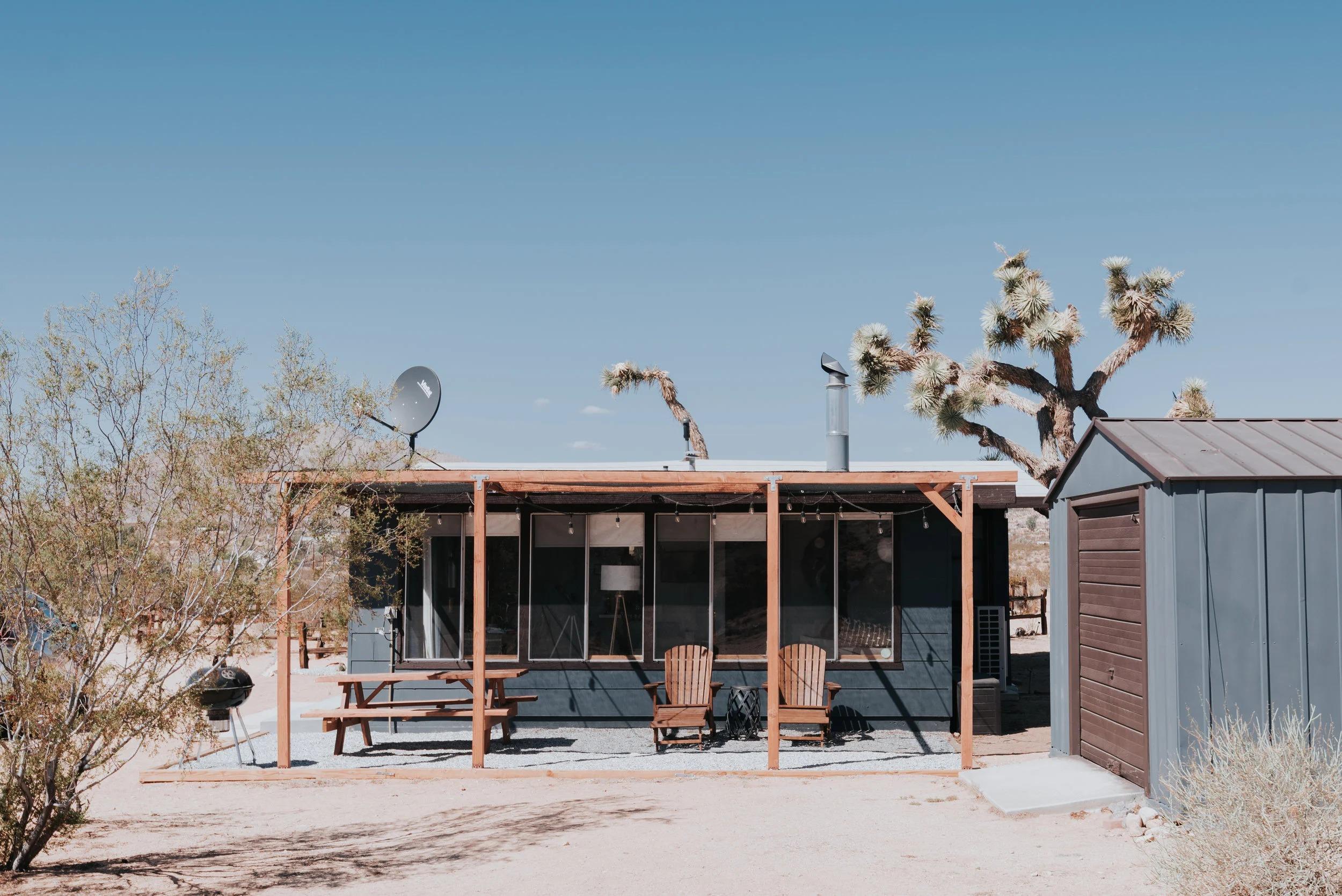 Renovated and thoughtfully designed, The Moon Cabin is a 1959 Homesteader cabin perfect for couples or small families. Stocked with all the essentials and more, the cabin has everything you need for a rejuvenating escape. On two quiet acres in north Joshua Tree, the cabin is nestled at the base of Bunker Mountain surrounded by boulder croppings.