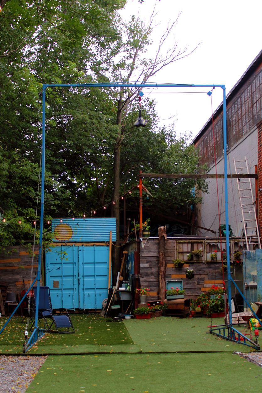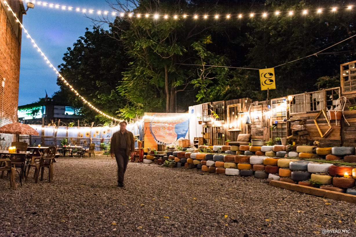 Tucked behind The Muse Brooklyn's circus center and event warehouse, you'll find over 3000 sq ft of artistic outdoor space, perfect for crafting your next event! Newly renovated, this space is now open and available for rental. Our backyard was built by hand with 100% green, earth-friendly, recycled materials. This intimate outdoor setting is perfectly adaptable for diverse needs of all sizes.