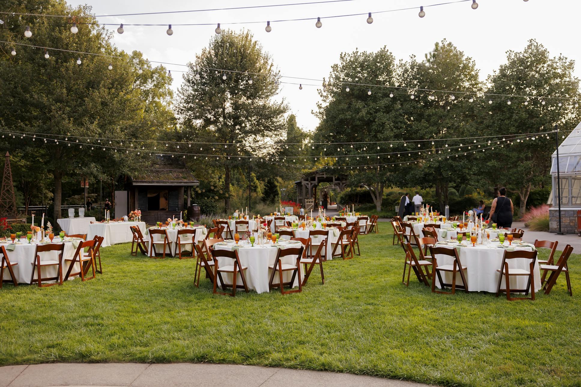 The expansive green space is framed by built-in outdoor string lighting, casting a soft, romantic glow as the evening unfolds. Guests will be captivated by the picturesque views of the exhibit greenhouse, where lush greenery and vibrant plant life create a stunning backdrop for a ceremony or reception. Whether used for an intimate ceremony beneath the stars or a reception filled with laughter and dancing, this tranquil outdoor space provides the perfect setting for a memorable celebration. Available for: ▸Ceremony-Only Package ▸Reception-Only Package ▸Full Wedding Package ▸Rehearsal Dinner Package