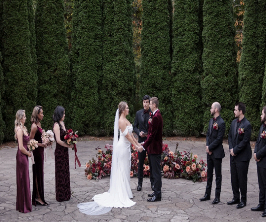 The stunning landscape is complemented by a large, serene pool with an elegant water feature, creating a tranquil atmosphere. Imagine exchanging vows or sharing a glass of champagne with your guests, surrounded by luscious trees and the sound of cascading water adding to the sense of serenity. Whether it's an intimate gathering or a grand celebration, this location blends natural beauty and luxurious amenities to create an unforgettable wedding experience. Available for: ▸Ceremony-Only Package ▸Full Wedding Package ▸Cocktail Hour Add-On