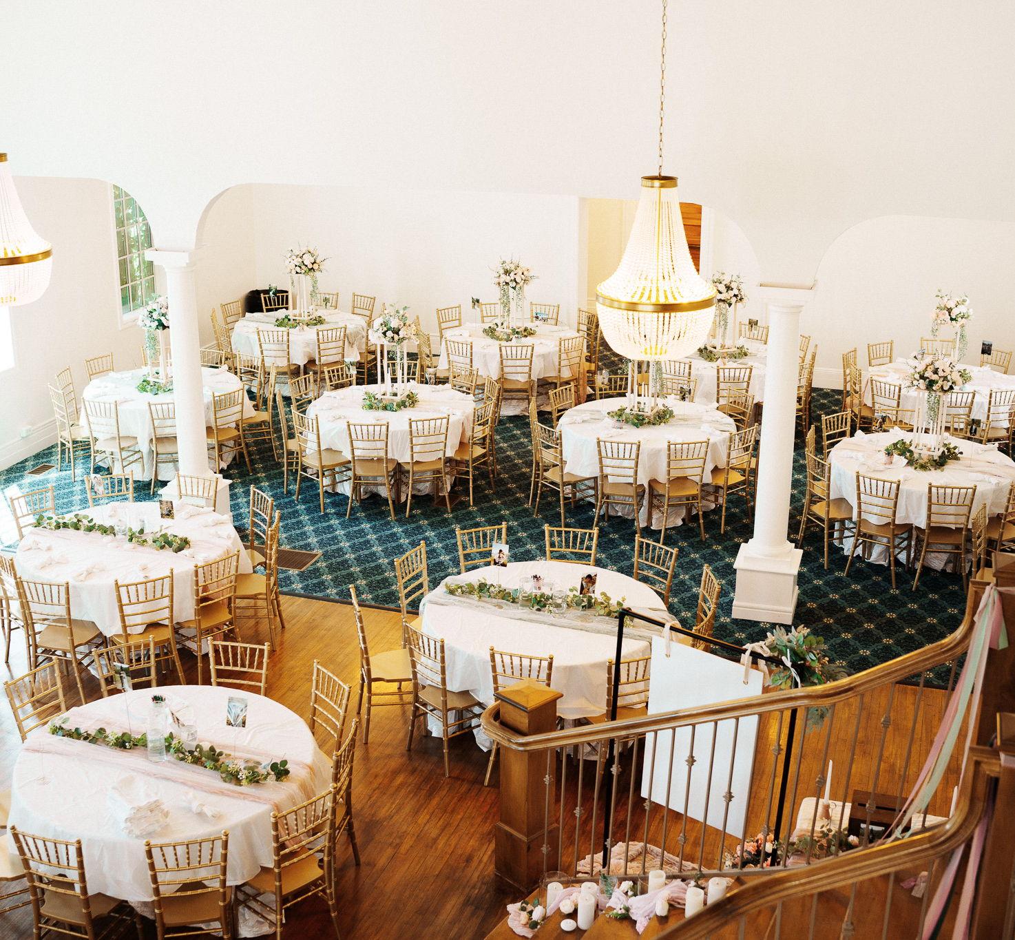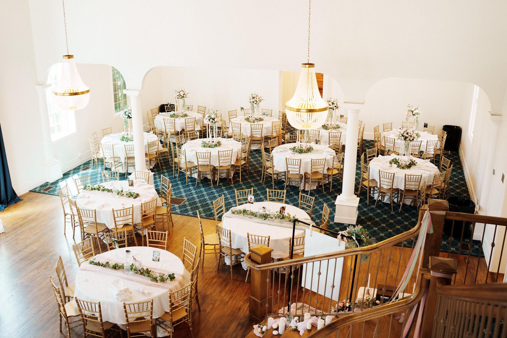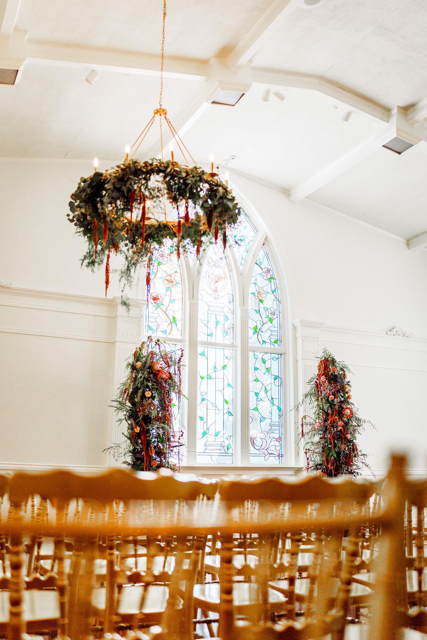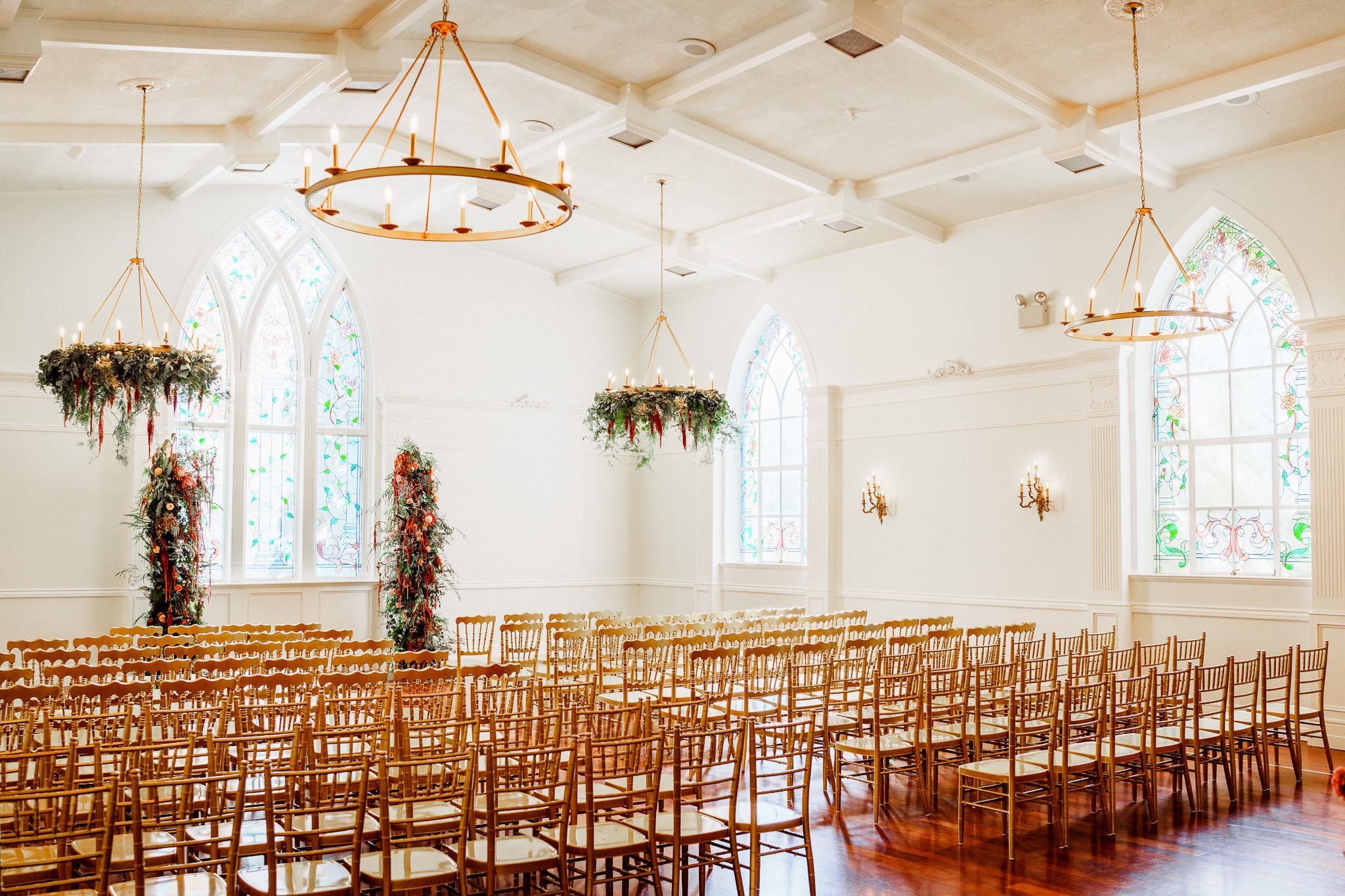 The Monarch revolves around grand stained glass windows of ivy and blush roses, ushering in a glowing sense of light and love to any experience. Vintage sconces line the walls and the tall ceilings create a luxurious atmosphere. A dual-sided mahogany staircase spills into the room allowing for a magical entrance, with a grand piano at its base. The Monarch is the perfect space for any ceremonies, gatherings, and other festivities.
