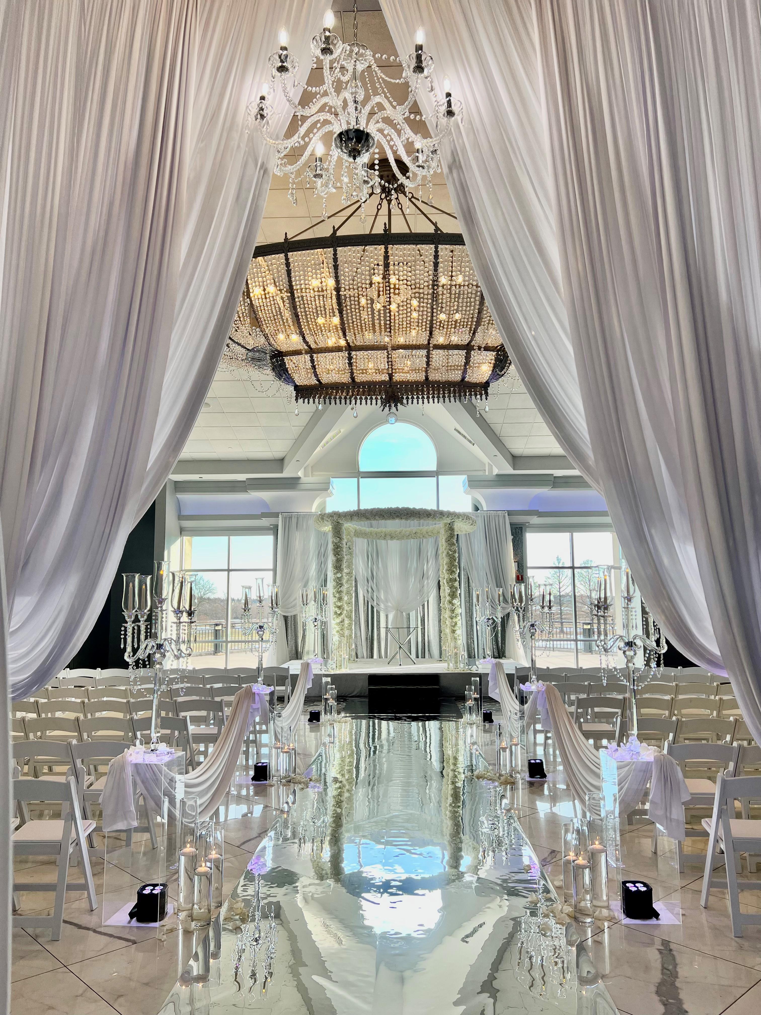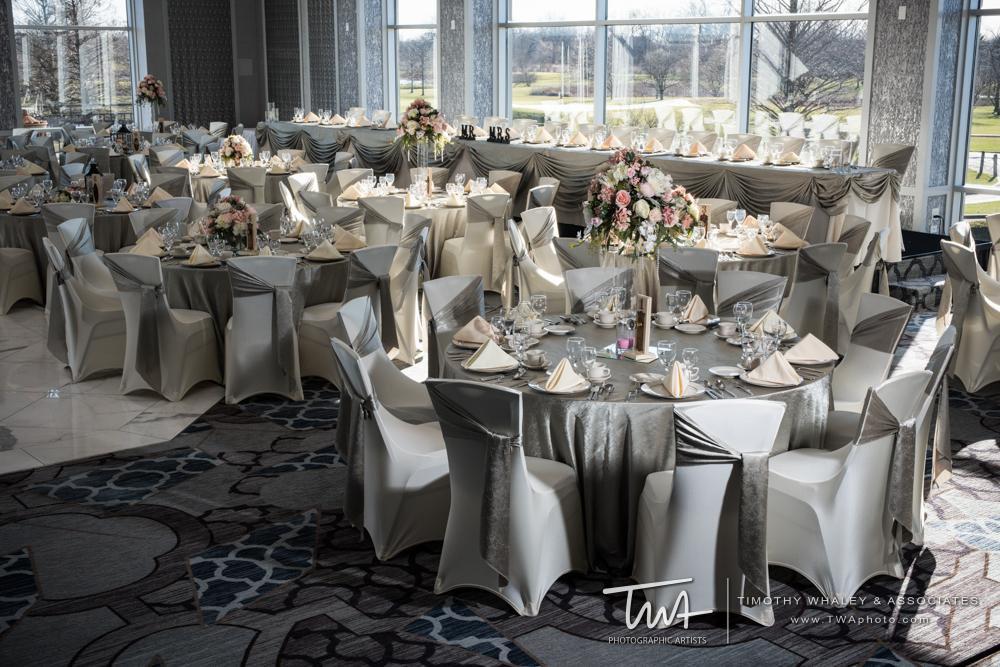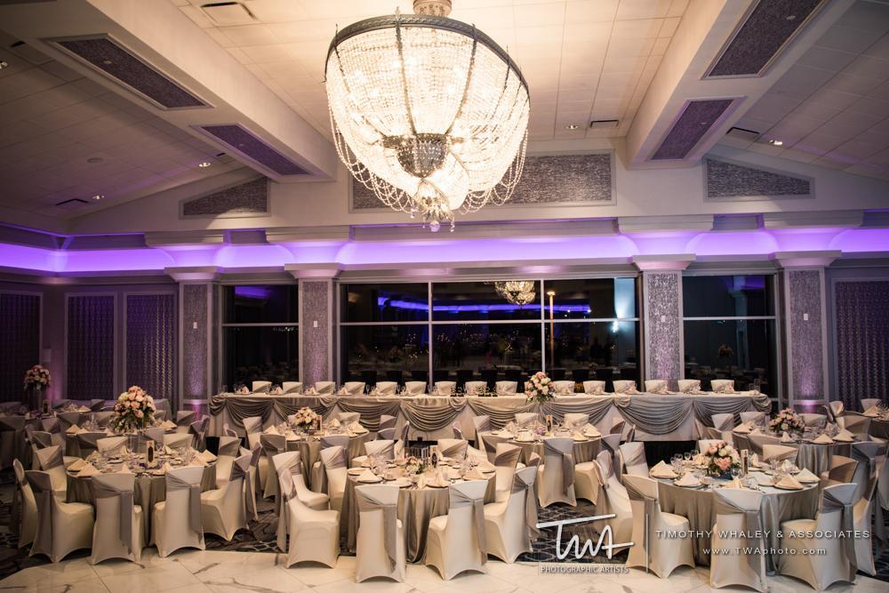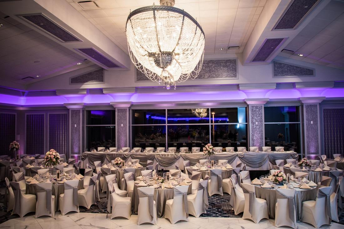 Chandelier and dimmable lighting throughout ballroom. 120' of floor to ceiling windows overlooking our well manicured grounds. Two built in bars for increased guest service.