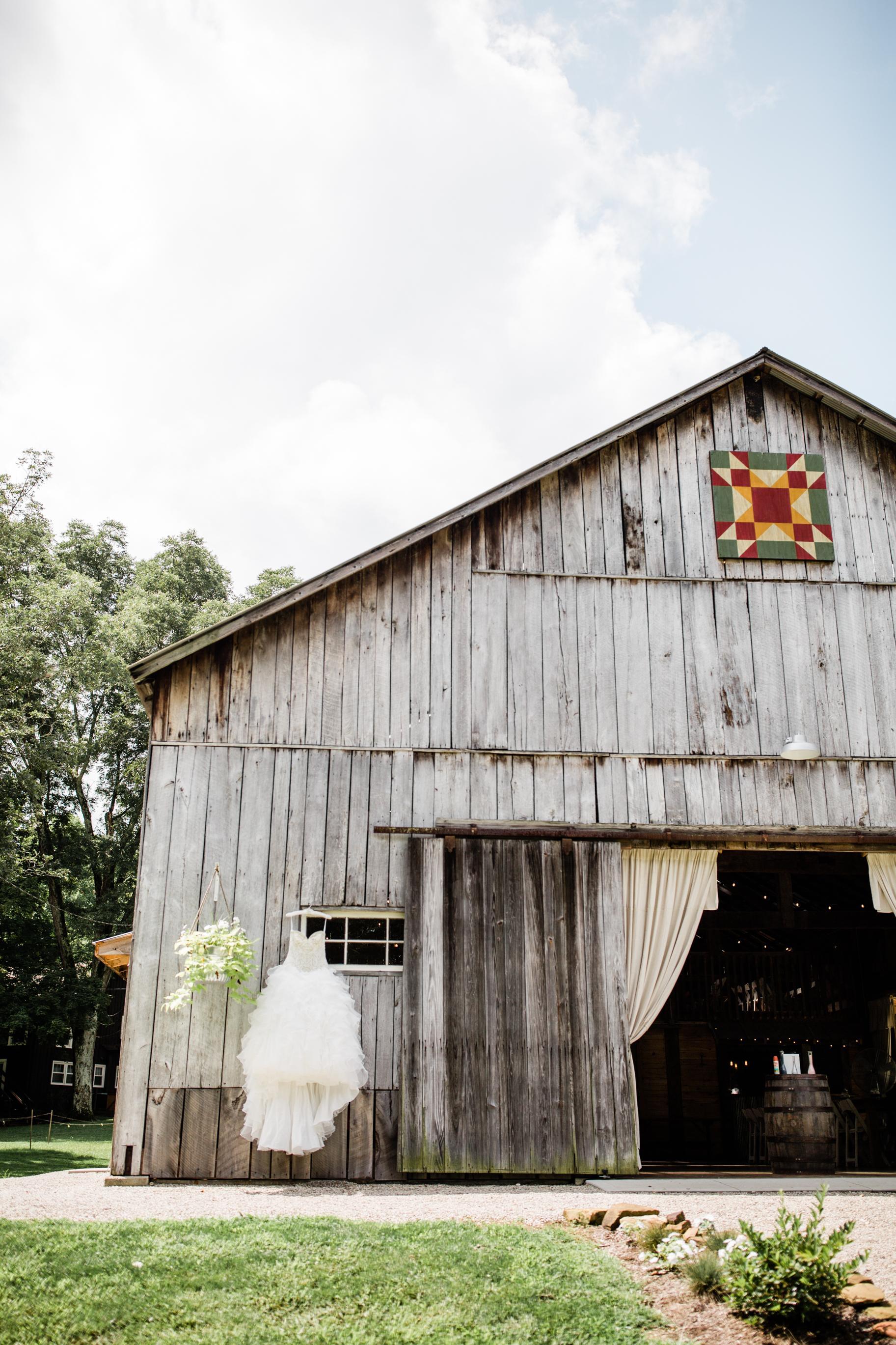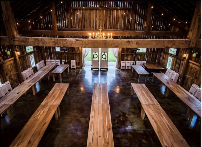 - 180 total guest capacity; 120 main barn level, 60 upstairs loft - 8' rustic harvest tables and chairs for 180 guests - (2) 6' long rustic harvest tables - Wooden benches for outdoor ceremony area - Wireless internet - Speciality lighting: chandeliers, market and sconce lighting - Barn door drapery - Indoor restrooms (ADA Compliant) - Built-in bar - (6) Wooden wine barrel cocktail tables - Catering prep area - Onsite parking - Onsite dumpster