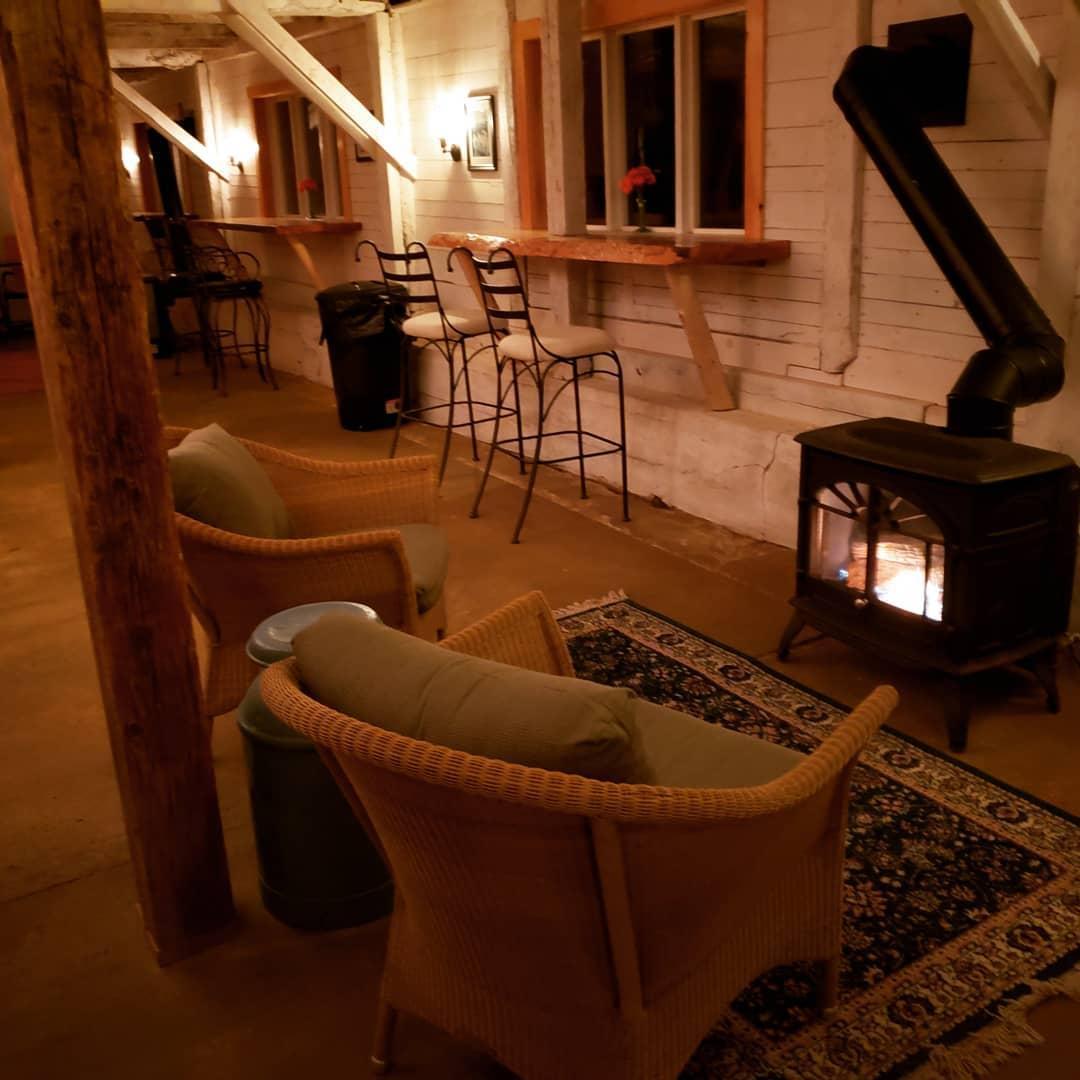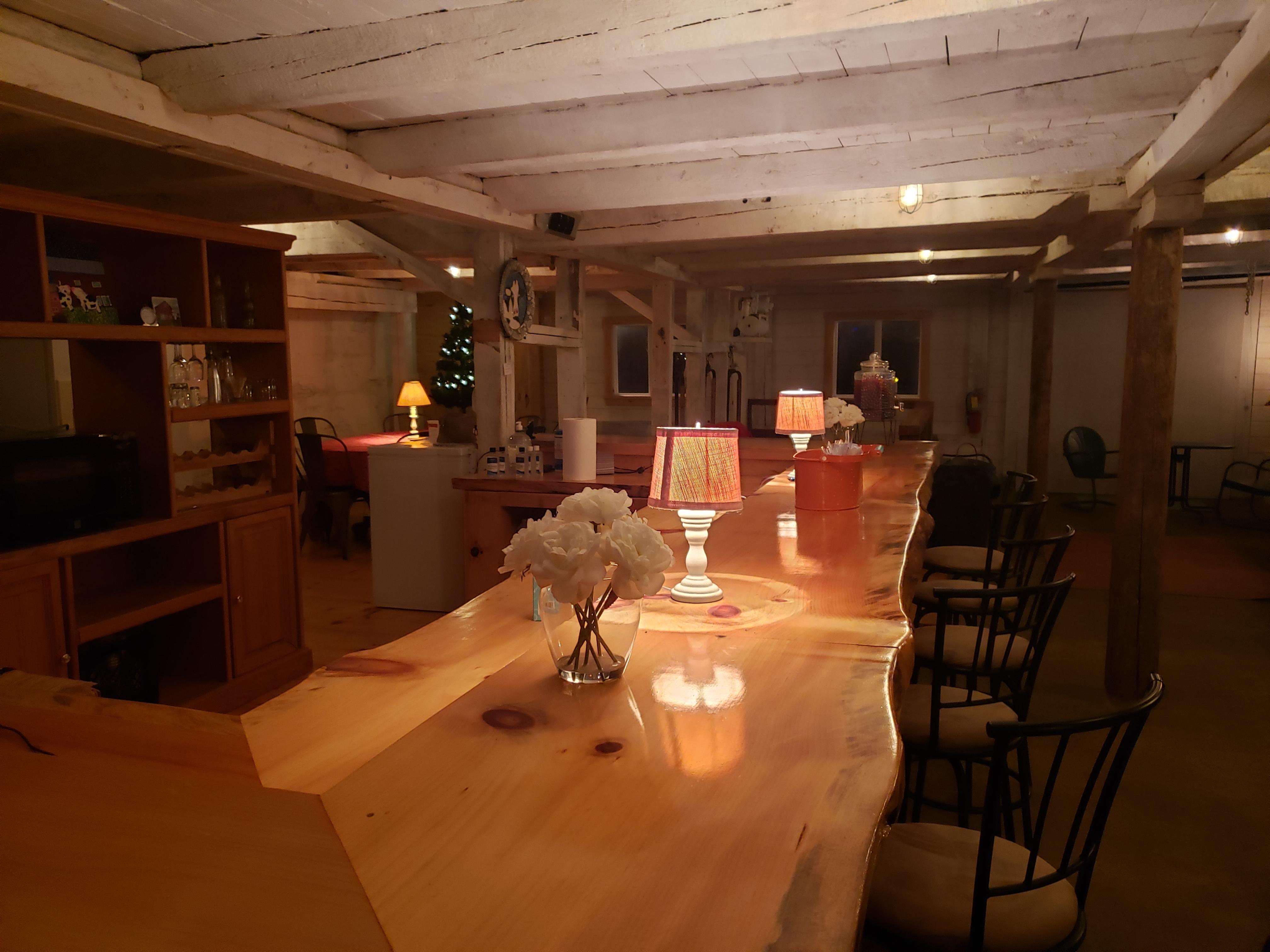 - A stunning 30 foot live edge bar. - Gorgeous 2 ft. wide wood plank flooring. - Two glass front stoves for a chilly night or ambience. - Ample space and tables for appetizers. - Plenty of refrigerator and freezer space for food and beverages. - The perfect space for cocktails and conversation. - The attached milk house for changing or preparation.