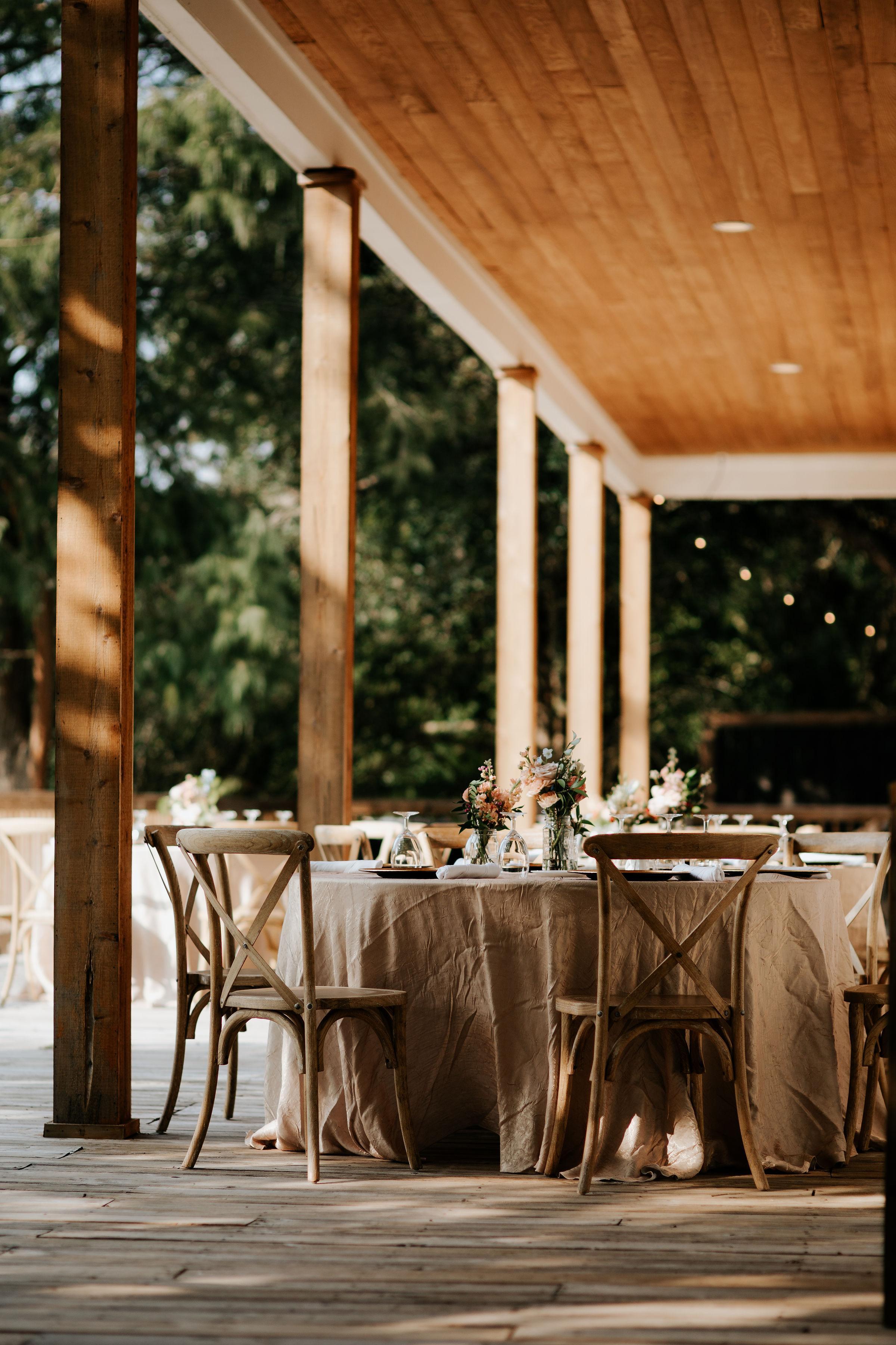 - Tables, Chairs, Linens, and China (there are options) - 4 Wooden Trestle tables that can be used for a Sweetheart or Head Table - Lounge Area - Coffee Credenza - Wooden Buffet for Cards and Gifts - Trendy Gold Circle Mirror - 3 Gold Chandeliers - Full-Service Catering - Non-Alcoholic Beverages - Cake Service - Outdoor Fireplace with Seating - Bistro Lights - Gazebo