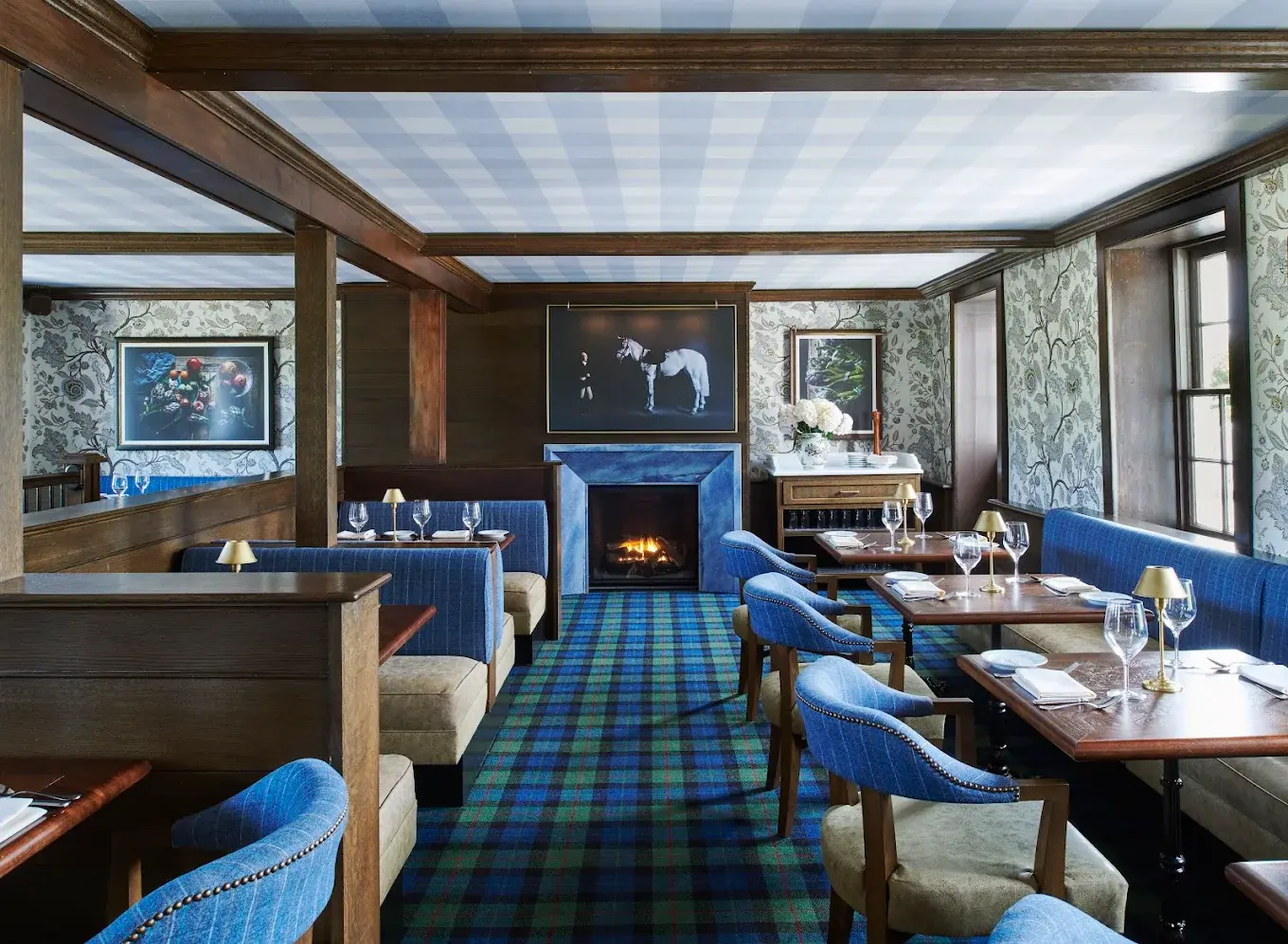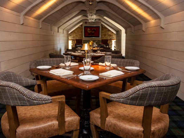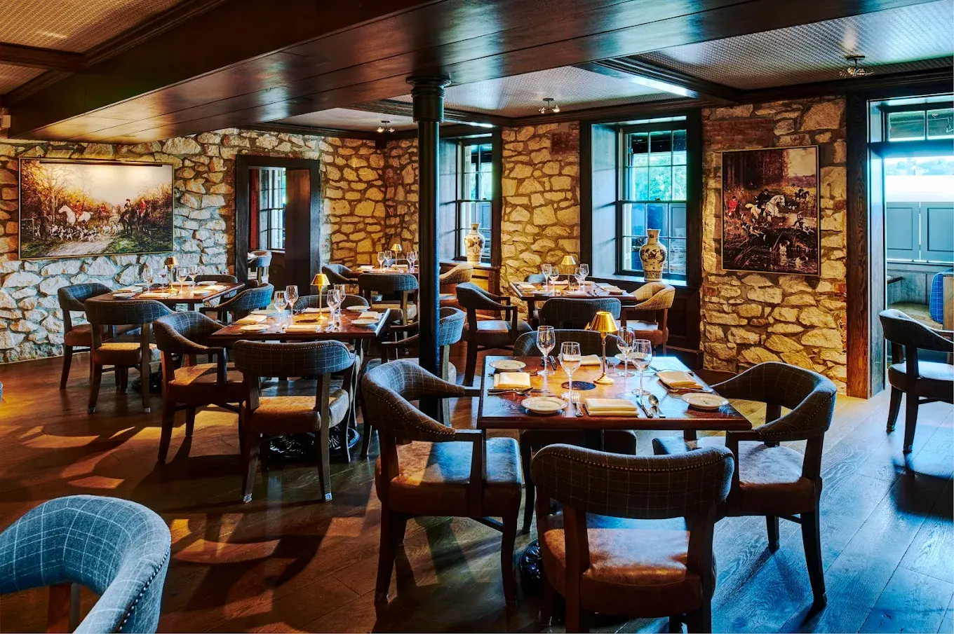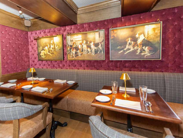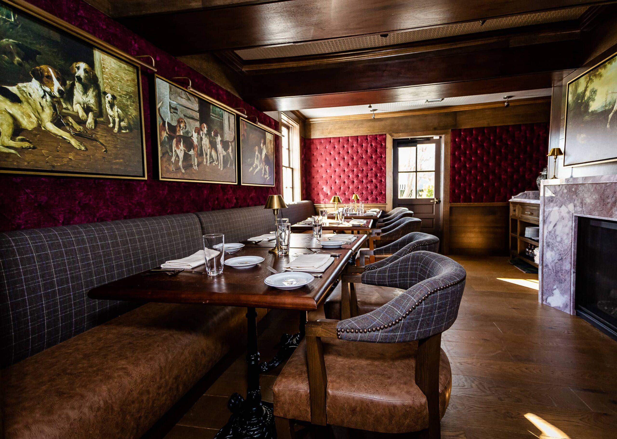 Adjacent to the main dining room, The Hound Room offers an intimate dining space with striking red pleated walls, a marble mantle fireplace, and a private entrance. Perfect for a romantic evening or special celebration, The Hound Room offers a unique and memorable dining experience.