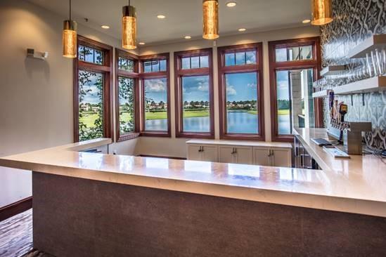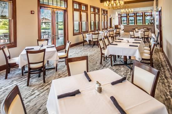 The Bistro & Terrace has a built-in bar, indoor and outdoor space, market lights and a gorgeous view of the lake and golf course.