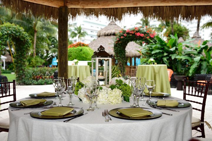 A chic space for lounging around outdoors, This Caribbean-style covered terrace, with rattan seating and colorful cushions, offers space for up to 60 guests for cocktail receptions, pre-event drinks, and intimate get-togethers.