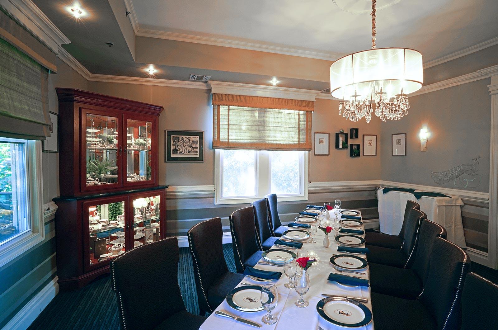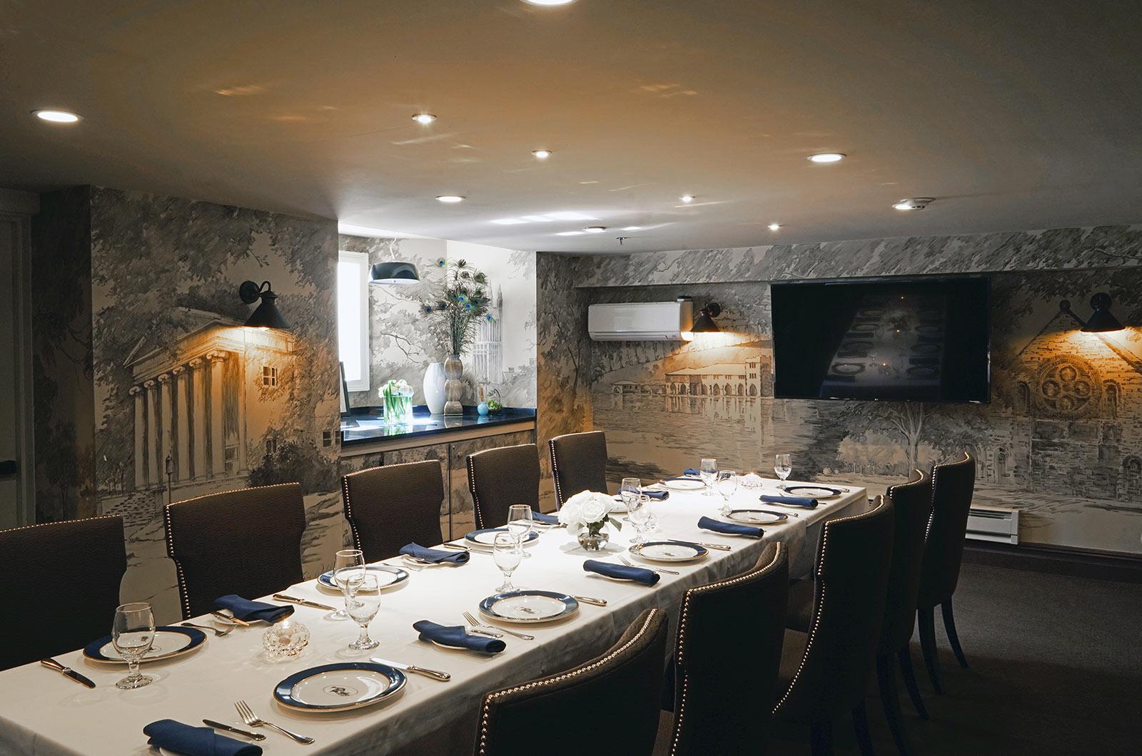 Peacock Alley is our most unique private dining space located on our lower level. This intimate space was former Speakeasy at the Inn and features a beautiful hand painted mural of downtown Princeton and Princeton University. Peacock Alley can accommodate up to 20 guests at one long table or up to 24 guests at three round tables of eight. This is a great option for corporate day meetings as well.