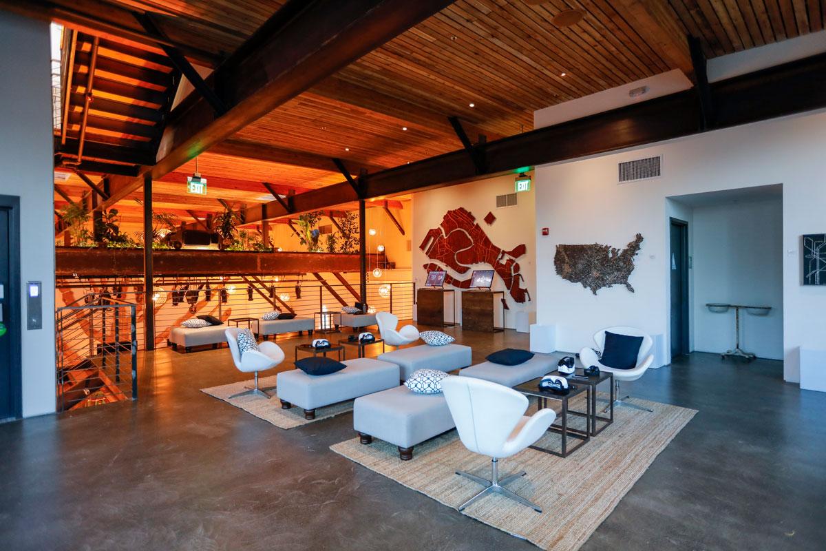 31-foot reclaimed cedar ceiling with skylights // Full bar service with beer and wine on tap // Full-scale catering kitchen with walk-in refrigerator & vendor staff room // Extensive in-house lighting with dimming control system // Plug & play theatrical lighting capabilities // 450 sq ft foyer with a coat check room and ADA elevator // Stairwell access to mezzanine and rooftop levels // Two original built-in gantry cranes that host an indoor living garden high above the main space // Restrooms