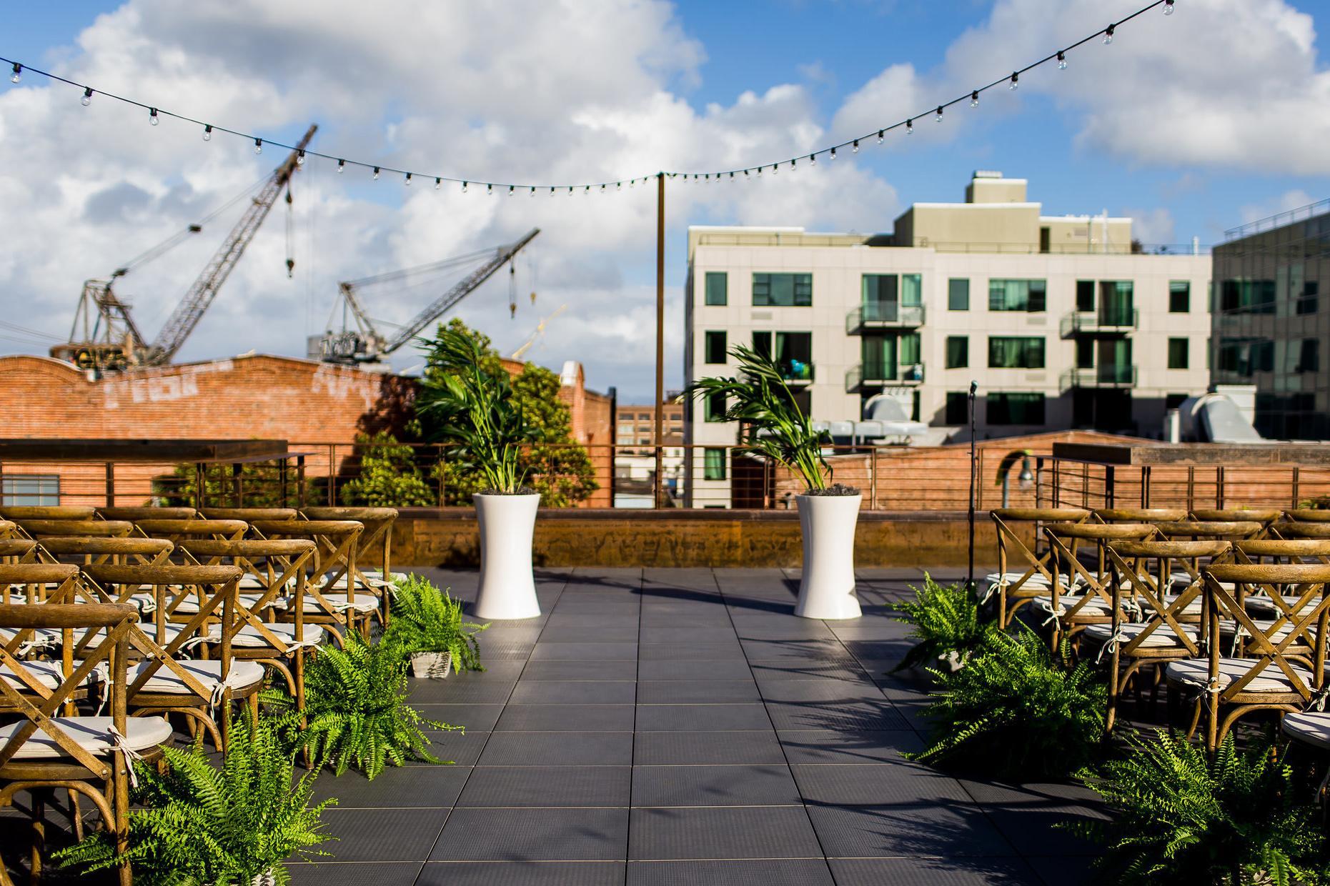 Gorgeous views of Dogpatch, The Bay, and Oakland hills // Rooftop garden // Tenting capabilities (exclusively through Bright Event Rentals) // Floor lined with Italian Porcelain tile // Catering prep area // Four skylights with drink rails and views of the main floor // Outdoor bistro string lights // Accessible by elevator, as well as both FOH and BOH stairwells // In-house outdoor lounge furniture, heaters, and umbrellas provided