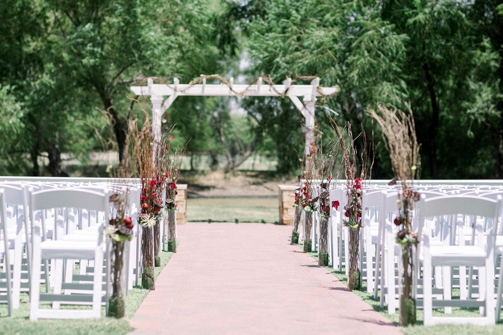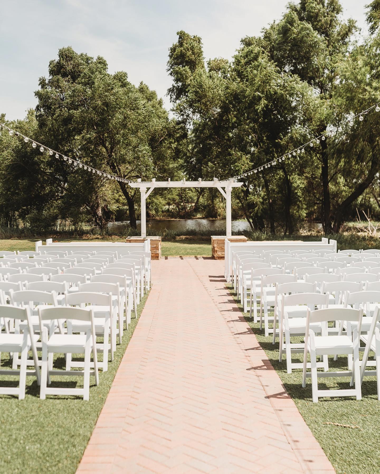 This space features a beautiful tree scape area surrounding a pond with a water fountain. We have 200 padded white resin chairs on astroturf.