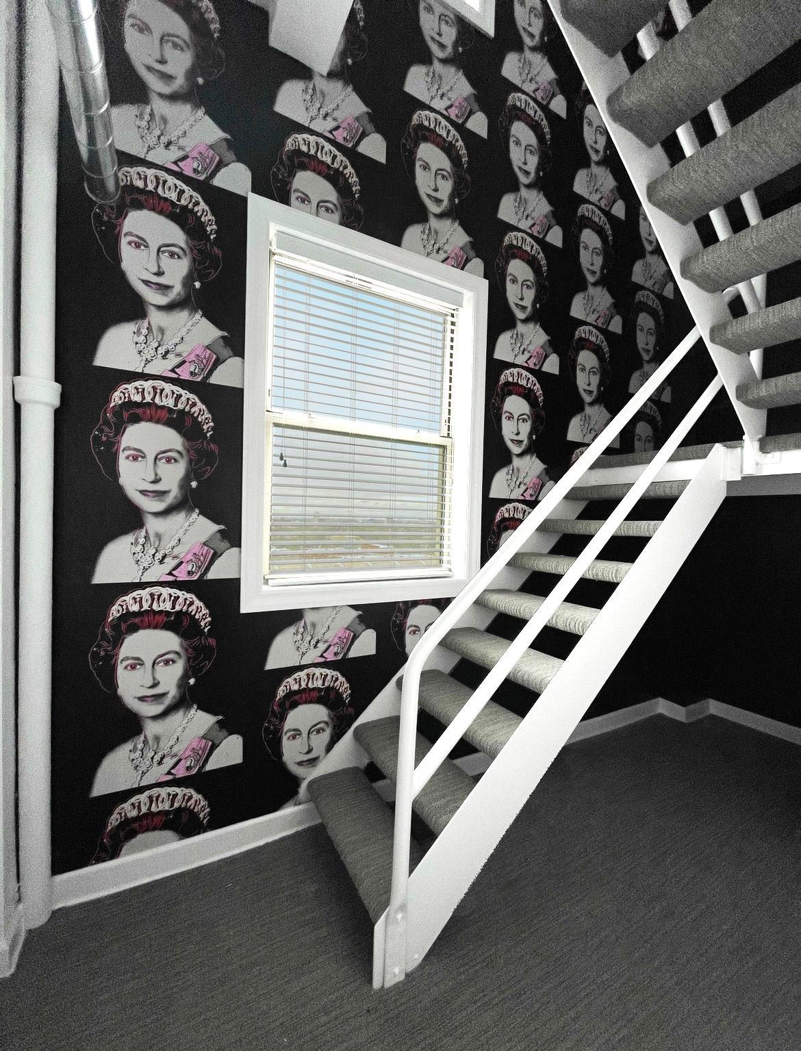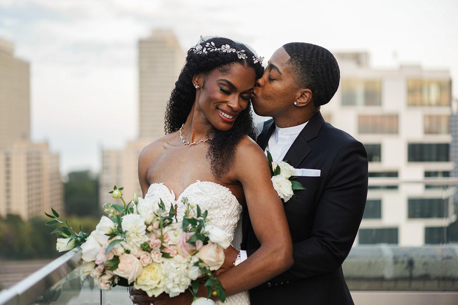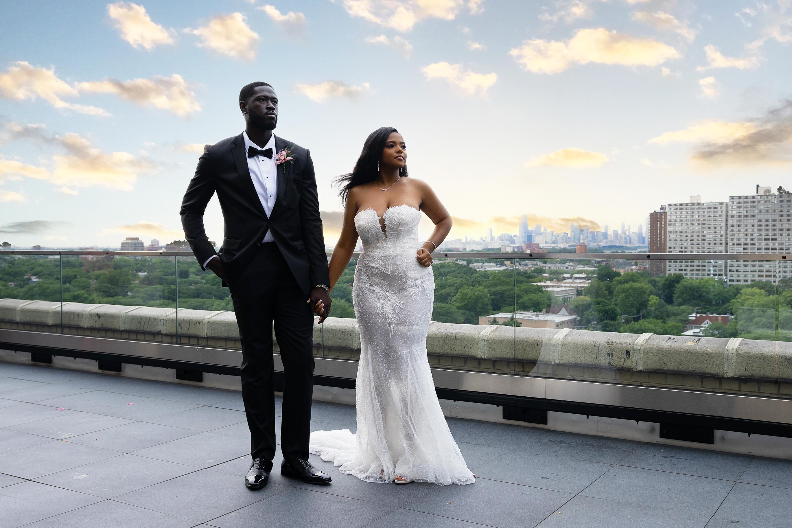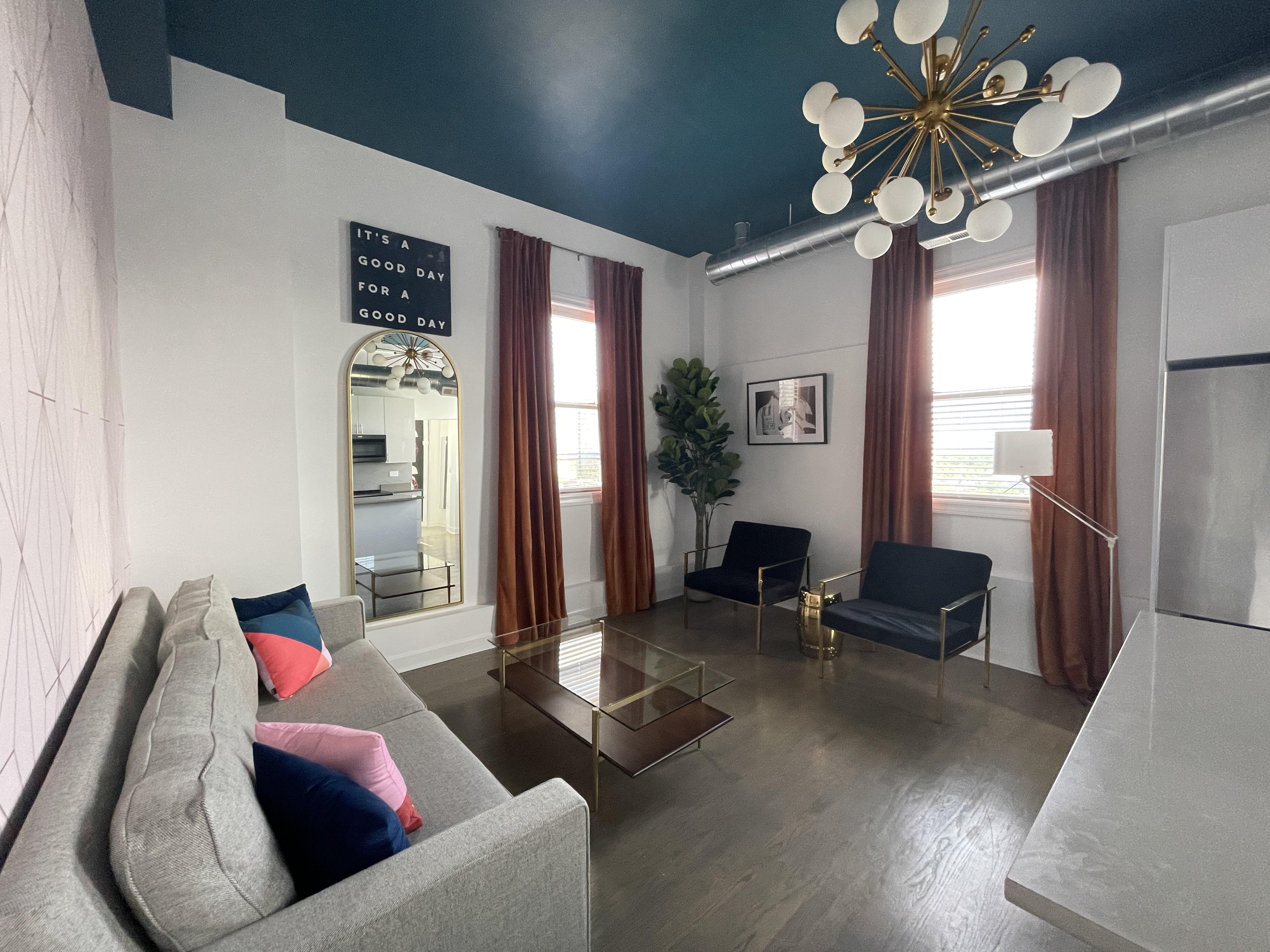 If you want to feel like royalty on your wedding day, look no further. This two-story suite features lounges and private bathrooms on both levels. A full kitchen is also available downstairs. This makes for a perfect place for couples to get ready with their crews without seeing each other ahead of time. With 270º of windows, the natural light is impeccable. Designed with London and Piccadilly Circus in mind, so you will be sure to love the bold patterns, fun colors, and chic aesthetic.
