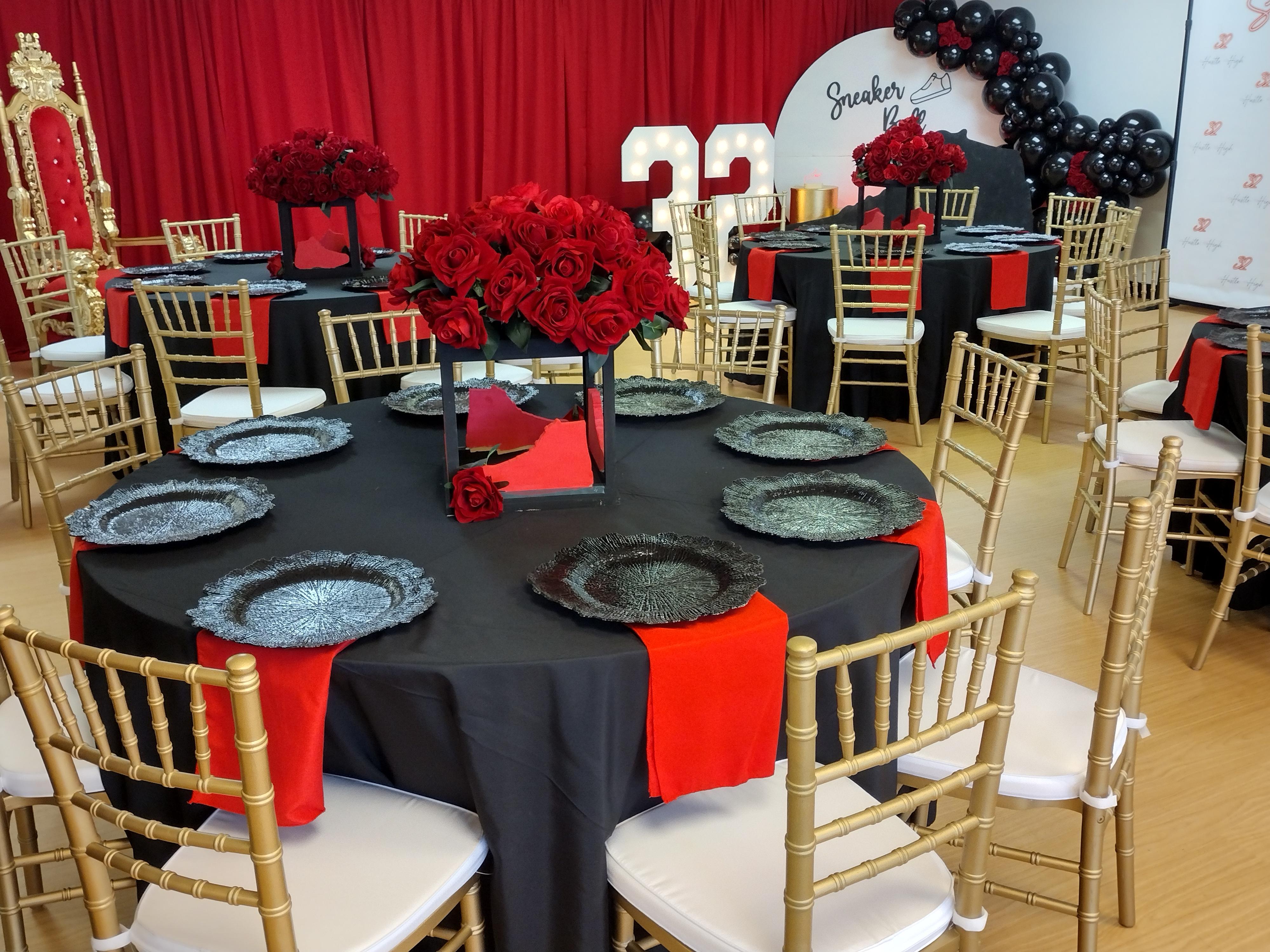 Intimate Event Venue perfect for micro weddings of 50 and under. Includes tables, chairs, tablecloths, throne loveseat and a gold shimmer wall for photos. We have 2 bathrooms, a small kitchenette area and lots of parking.