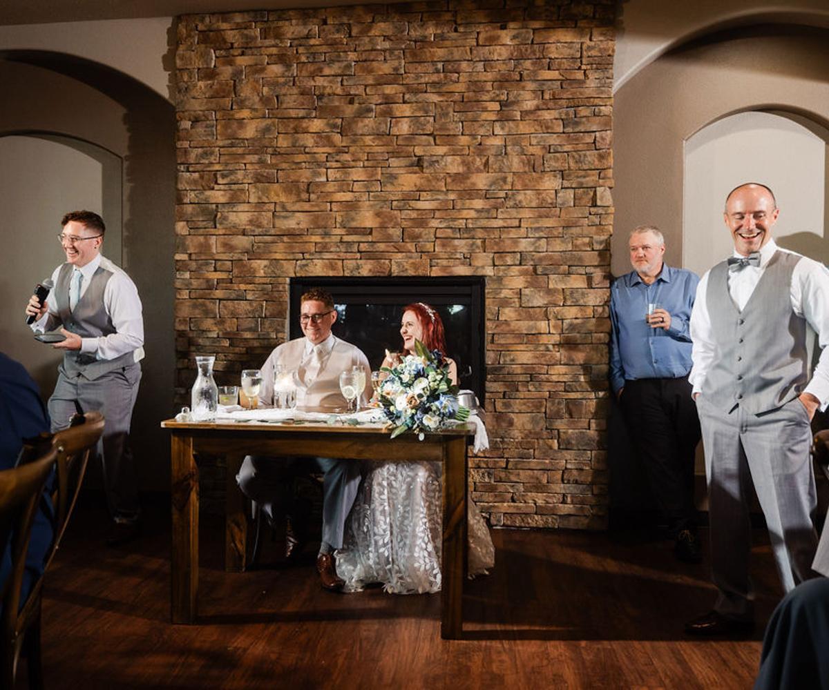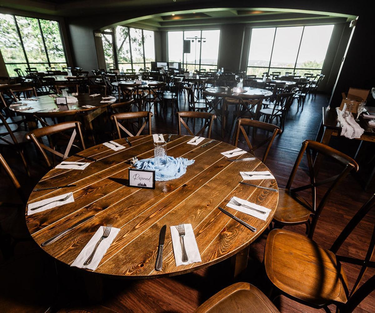 With tray ceilings, large windows, and beautiful views of the surrounding meadow, this reception space is an easy choice for your special gathering. There will be plenty of room to dance the night away, and the light gray paint and neutral accents allow you to add your personal style. The quaint built-in bar and rustic stone overlay add an extra touch of warmth and character, making it a cozy place for your guests to gather.