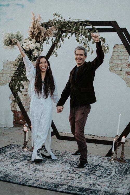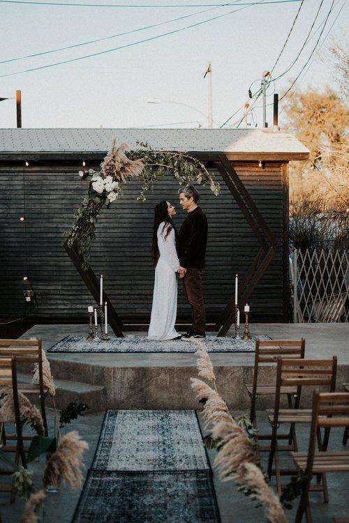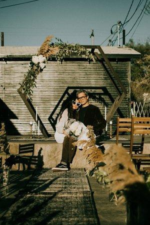 The Place To Be is an event space in Phoenix, Arizona, with all events coordinated by Dr. Laura Jaime. Located on Historic Grand Avenue, this courtyard reflects the eclectic atmosphere of its surroundings. The Place To Be offers three main wedding packages, both designed to reflect couples' individual tastes and preferences. All packages include wedding decor such as ceremony arches, greenery, and rugs. The dedicated staff oversees setup and cleanup and will curate floorplans to match your event's style and size. Laura works closely with each couple during their planning process. You will also have access to a variety of items in their inventory, including linens, dinnerware, and silk flowers. While you are welcome to select your own vendors, The Place To Be is happy to provide you with recommendations. They have partnered with unique entertainment options, including flash tattoos, bartenders, and fire-dancing performances.
