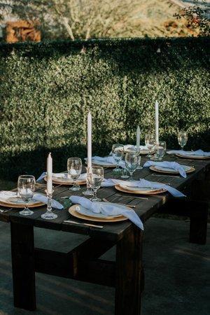 We provide custom wedding design and decor, rustic farmhouse tables and chairs, place settings and table decor including: plates, chargers, flatware, goblets, candles, and linens. We also have a ceremony arch and backdrop with candles, rugs, dried and silk flowers with fresh eucalyptus throughout the space.