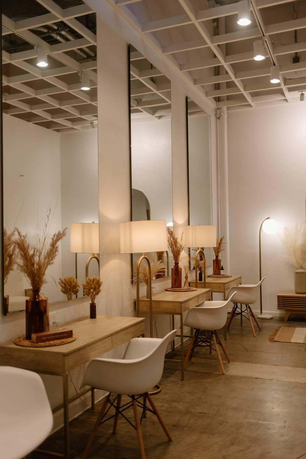 Custom Birch Tables for Communal Seating, Modern Lounge Vignettes, Warm Incandescent Lighting