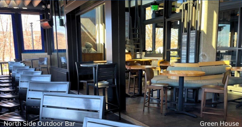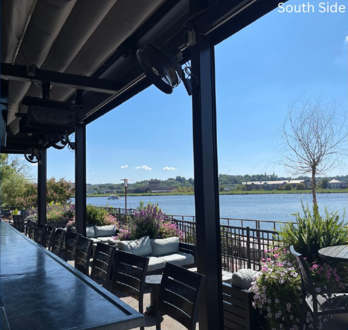 Our Outdoor Bar (reception style up to 75 guests) features stunning views of the river, fire pits, 4 HDMI TVs, fans, heating, and a retractable sunshade. We can also split the bar in to multiple sections, divided off with stanchions. The North Side of the Outdoor Bar (reception style up to 35 guests) is just outside of the Interior Green House Room and combines perfectly with the space by raising the garage style doors. The South Side (reception style up to 30 guests) features fire pits and is our closest section to the Water. The West Side of the Bar (reception style for up to 25 guests) has drink rails and a direct view of James Creek Marina. During moderate weather, this space can be enclosed with clear, protective siding allowing your group to still utilize the space while maintaining our gorgeous views! Please note that the protective siding does compromise the use of the Firepits.