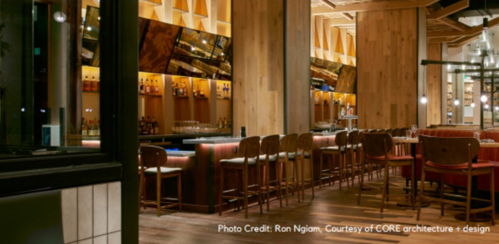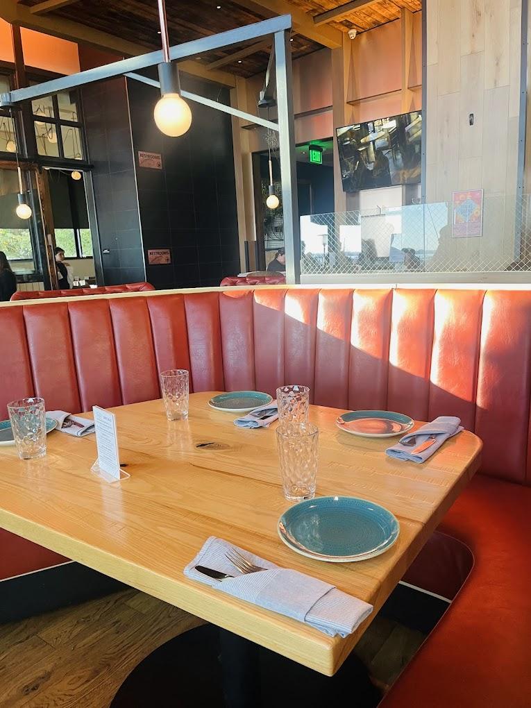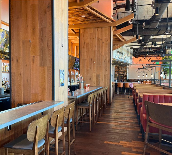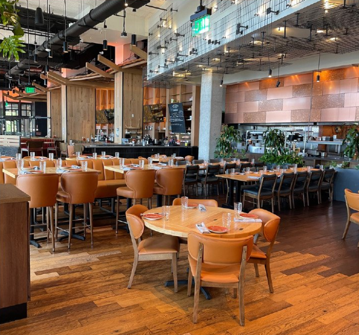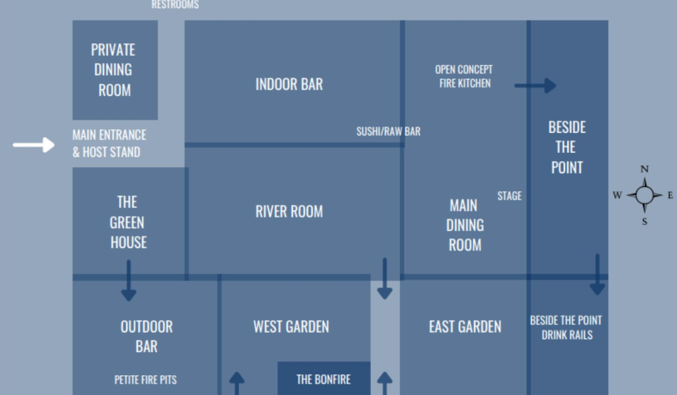 The Main Dining Room (up to 125 guests reception style | seated up to 100 guests) -is our most vibrant of the spaces—you're able to view our flame kitchen, raw/sushi bar, outdoor dining and riverfront all from this space. The room also features an elevated stage area and our 3 bays (rounded semi-private booths). To add some Bar access, you may be interested in adding the Sushi Bar Nook or the entire Indoor Bar to your event. The space also overlooks the East Garden Patio, which would be a great option to add some outdoor space to your booking!