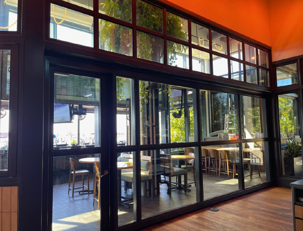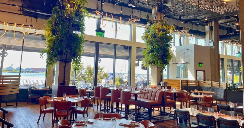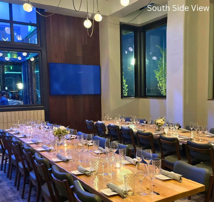 This space features views of the outdoor patios and riverfront, booth and banquette seating. Other guests will be able to pass through the room to reach spaces beyond this area, but the space would be reserved for your group alone. There are no AV options available in this space.