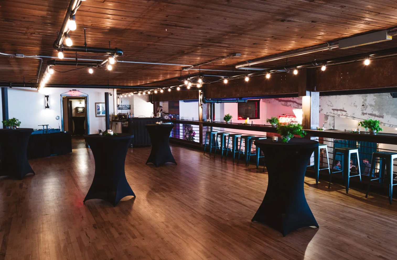 The perfect space to party! Our mezzanine has a full bar as well as a full wall of bar stools. You and your guests can use this space to mingle, dance and relax. The overhead bistro lights add for a perfect cocktail hour vibe.