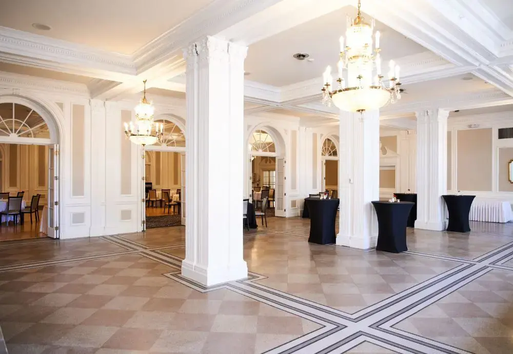 The Gold Room it features original terrazzo floors, historic columns and antique chandeliers. Enjoy your cocktail hour in this space before heading into The Queen’s Ballroom through the connecting French doors.