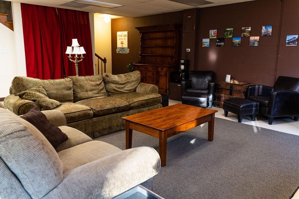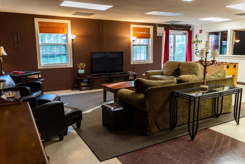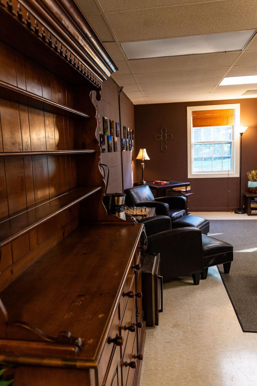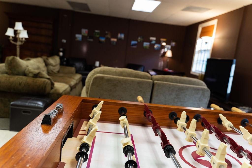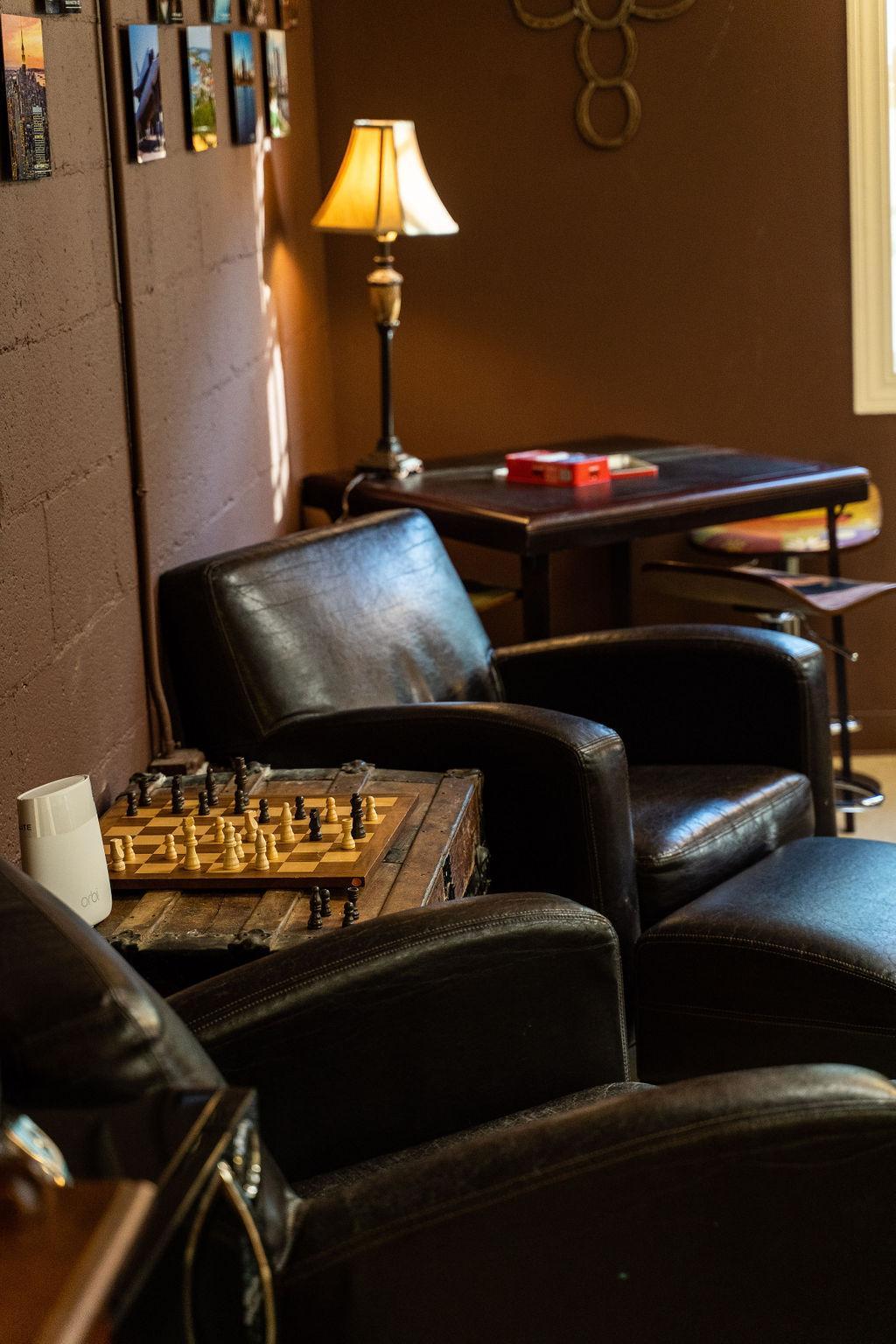 Foos Ball table, darts, chess, poker, TV, sofa, recliner loveseat, leather lounge chairs with ottomans, mini-fridge, microwave, mirrors, bathroom