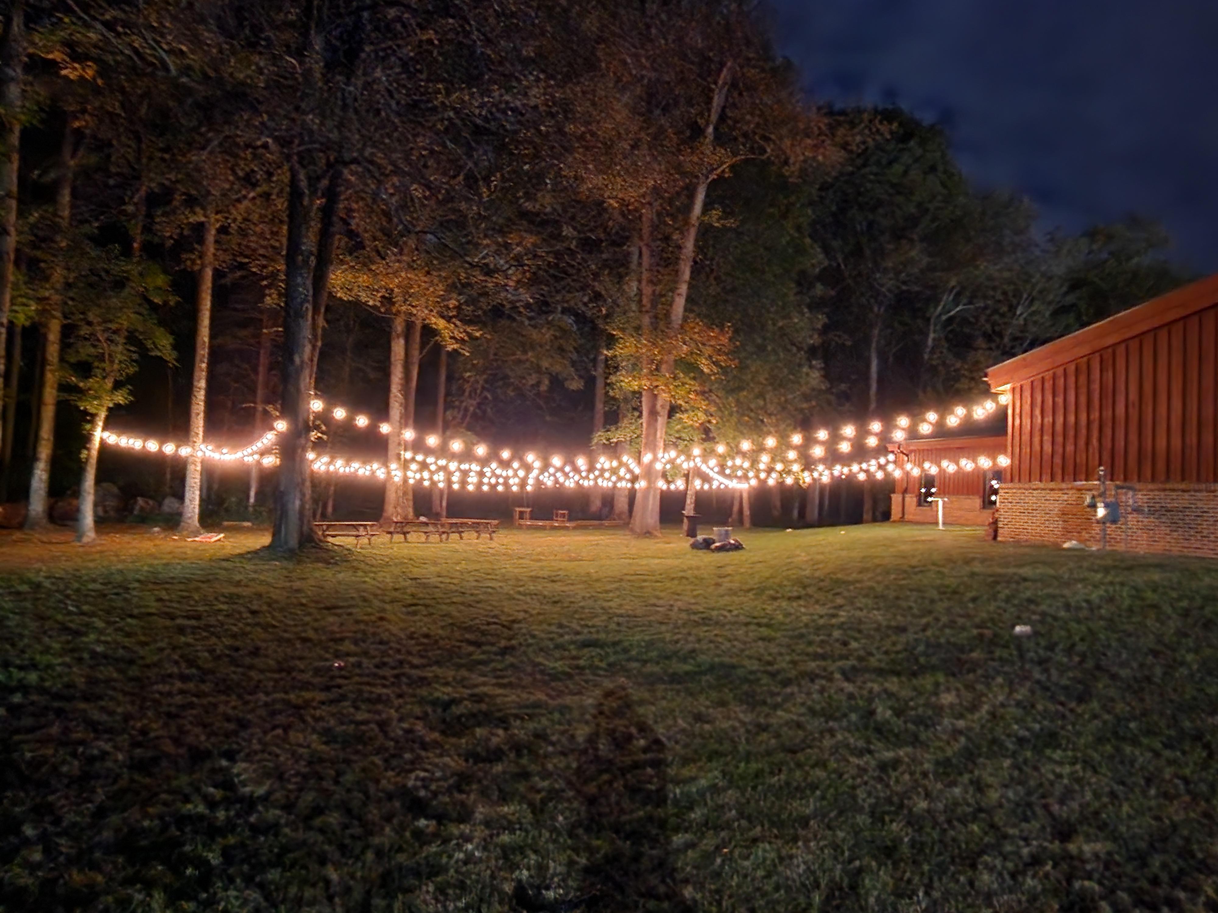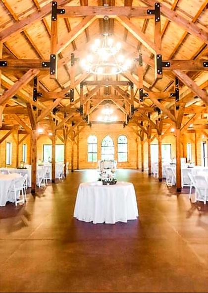 Chandeliers on dimmers for lighting customizing Large projection screen and full sound system Commercial ice machine Full commercial kitchen HVAC Accessible restrooms Tables, Chairs, Linens, Decor, Lawn Games