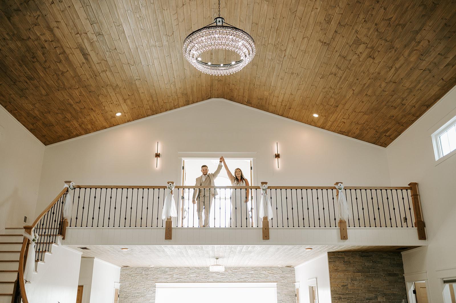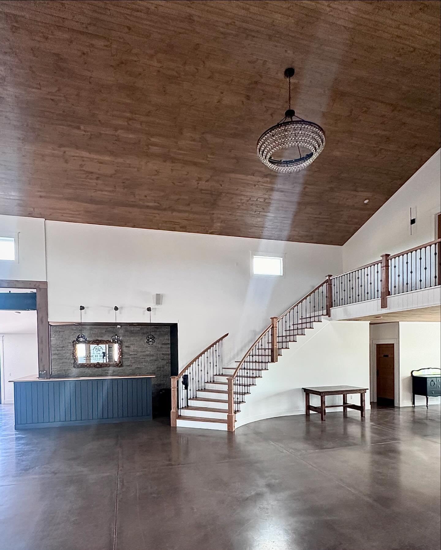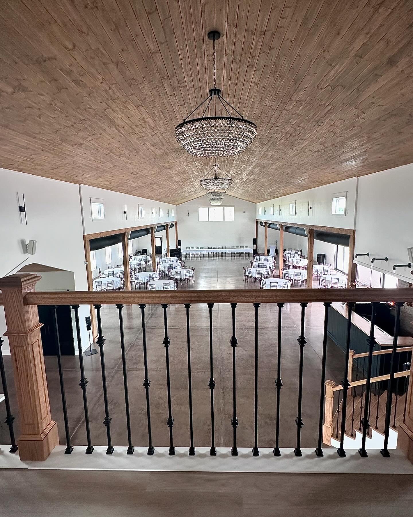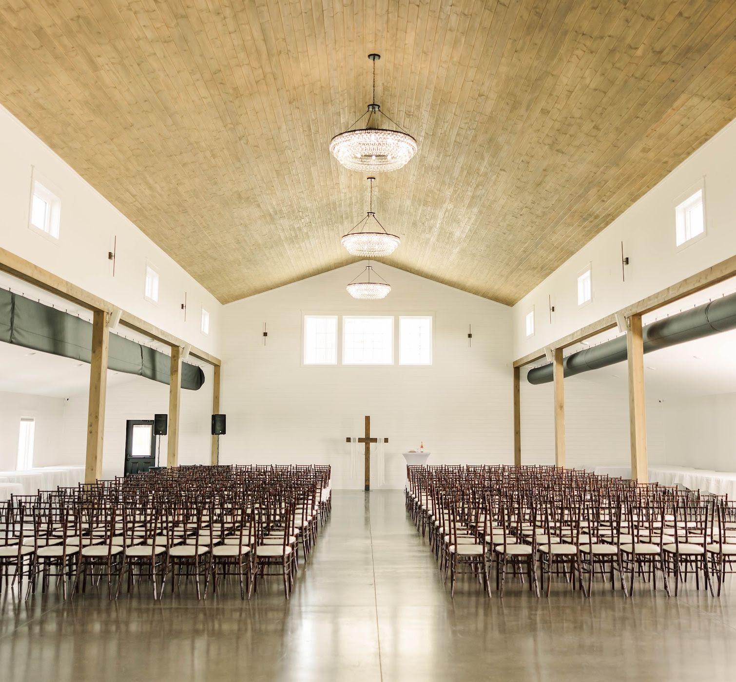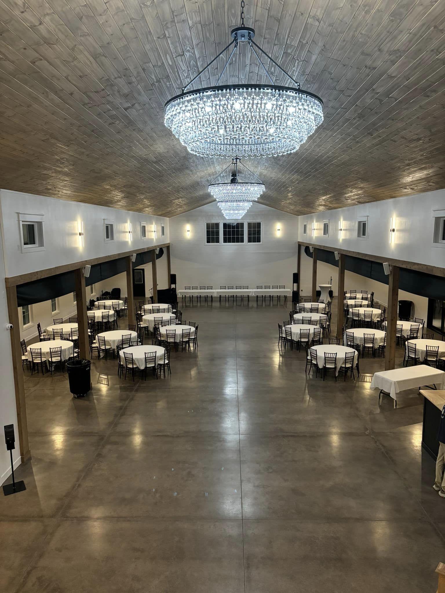 A contemporary barn style venue, characterized by a pristine white exterior stretching 60’ x 120’, crowned with a striking black roof. The venue features a large covered front patio and an expansive back patio, leading to a picturesque outdoor wedding area complete with a gazebo, custom made wooden benches & turf. Designed to accommodate up to 299 guests, this venue boasts an interior of white shiplap walls with stone accents & textures, cedar columns, elegant chandeliers, and a well-lit bar with beverage cooler and freezer for ice. A functional kitchen equipped with a refrigerator, freezer, double oven, and a spacious island facilitates food and floral preparations. Additionally, it includes accessible restrooms, a groom’s room with a TV, and a gorgeous bridal suite loft. This loft offers natural lighting, three makeup stations with lighted mirrors and salon style chairs, a lounge area, private restroom, and balcony access for a grand view of the celebrations below.