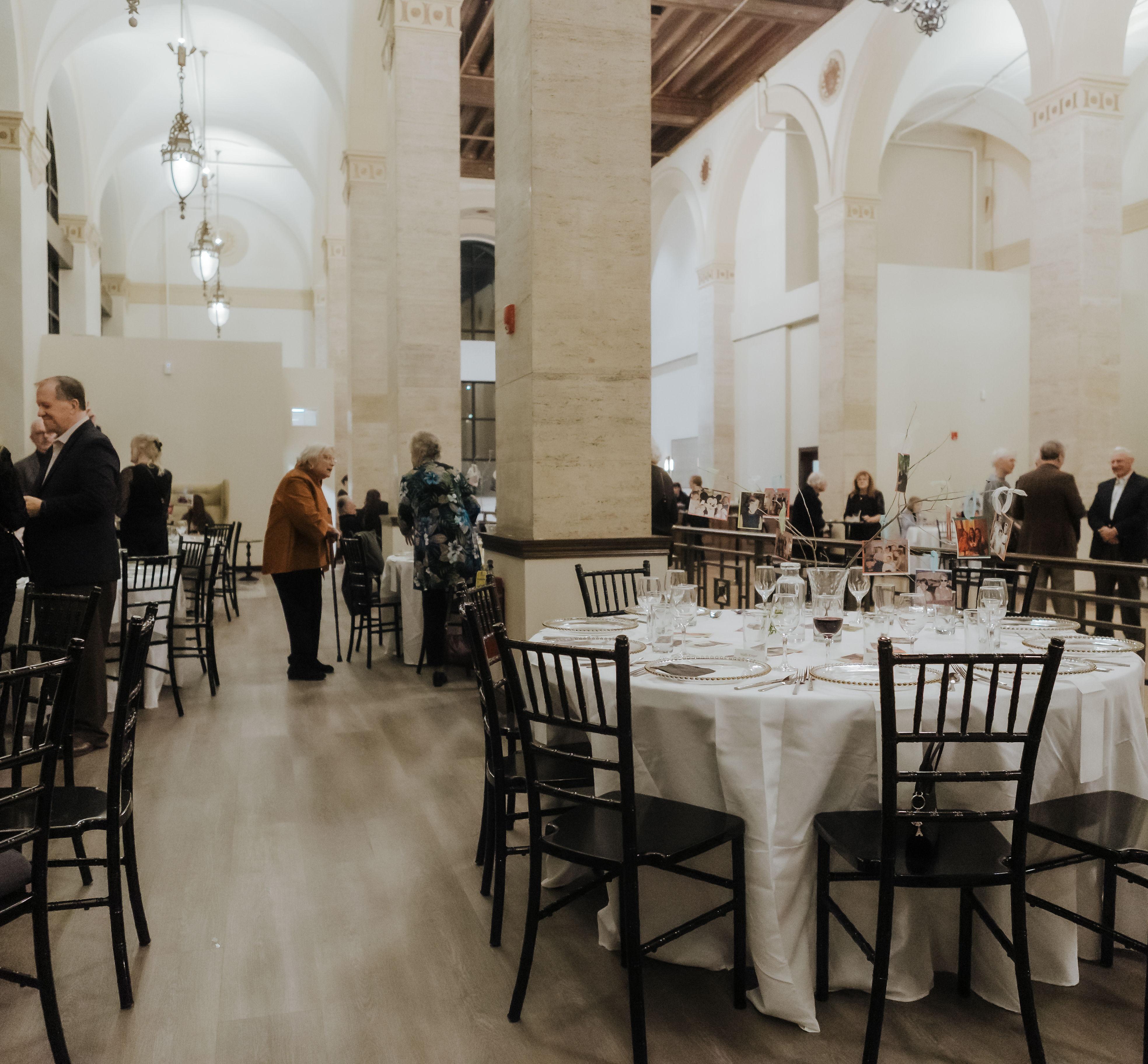 Picture The Reserve: A grand 3-story high, open space adorned with magnificent marble flooring, grand columns, wooden bar and more! The space is delicately illuminated by its restored, original fixtures made dimmable to create the perfect ambiance for your special day. Above, an ornate wood ceiling imported from Germany adds a touch of timeless elegance. The Reserve a Grand Venue or The Reserve is a glamorous event space, opening August of 2025. Located inside The Banc apartment building in Hammond, IN, the 3-story high event space is coming back to life! With a separate entrance leading into the venue, our space will seat up to 250 guests and have room capacity for up to 350 guests, for a cocktail style event.